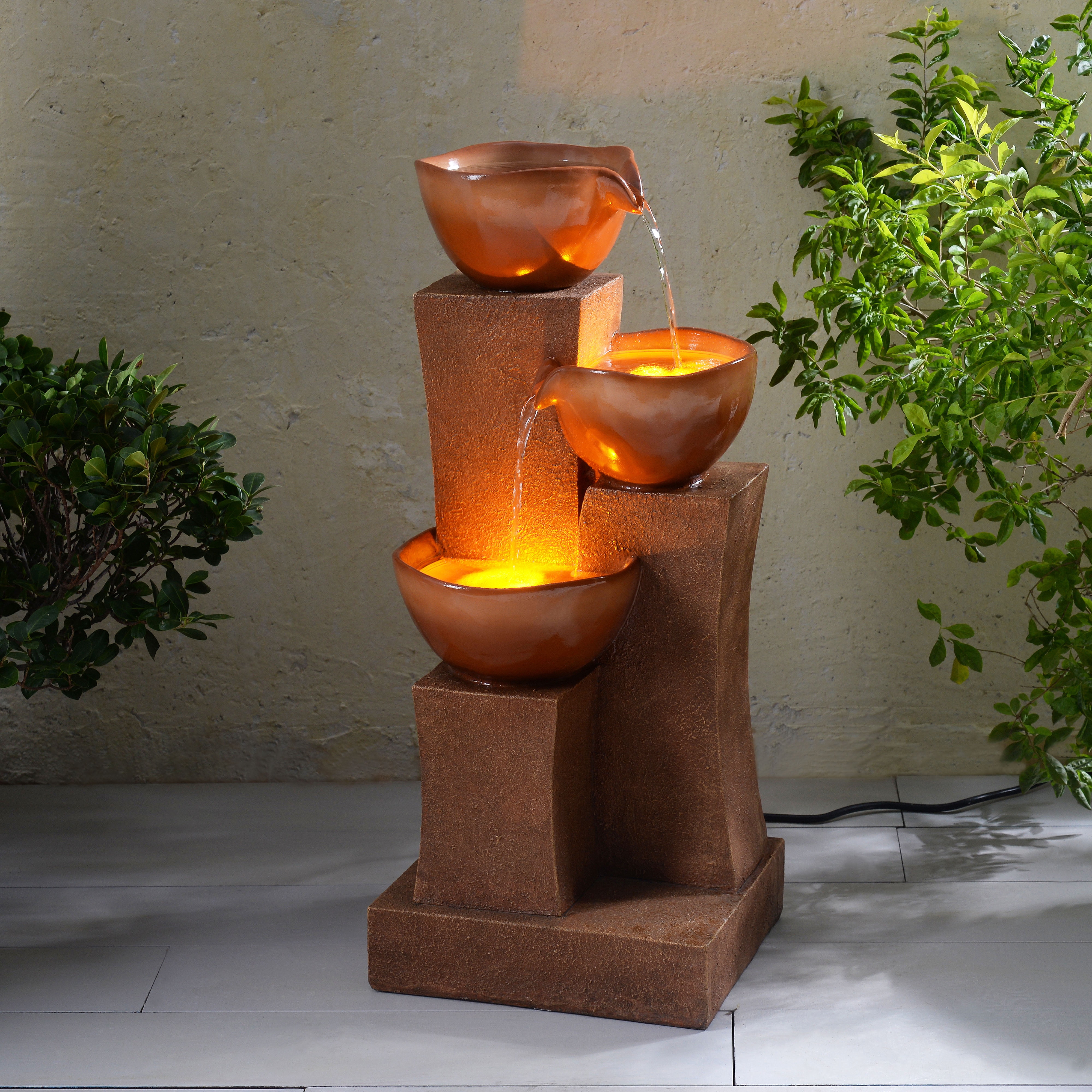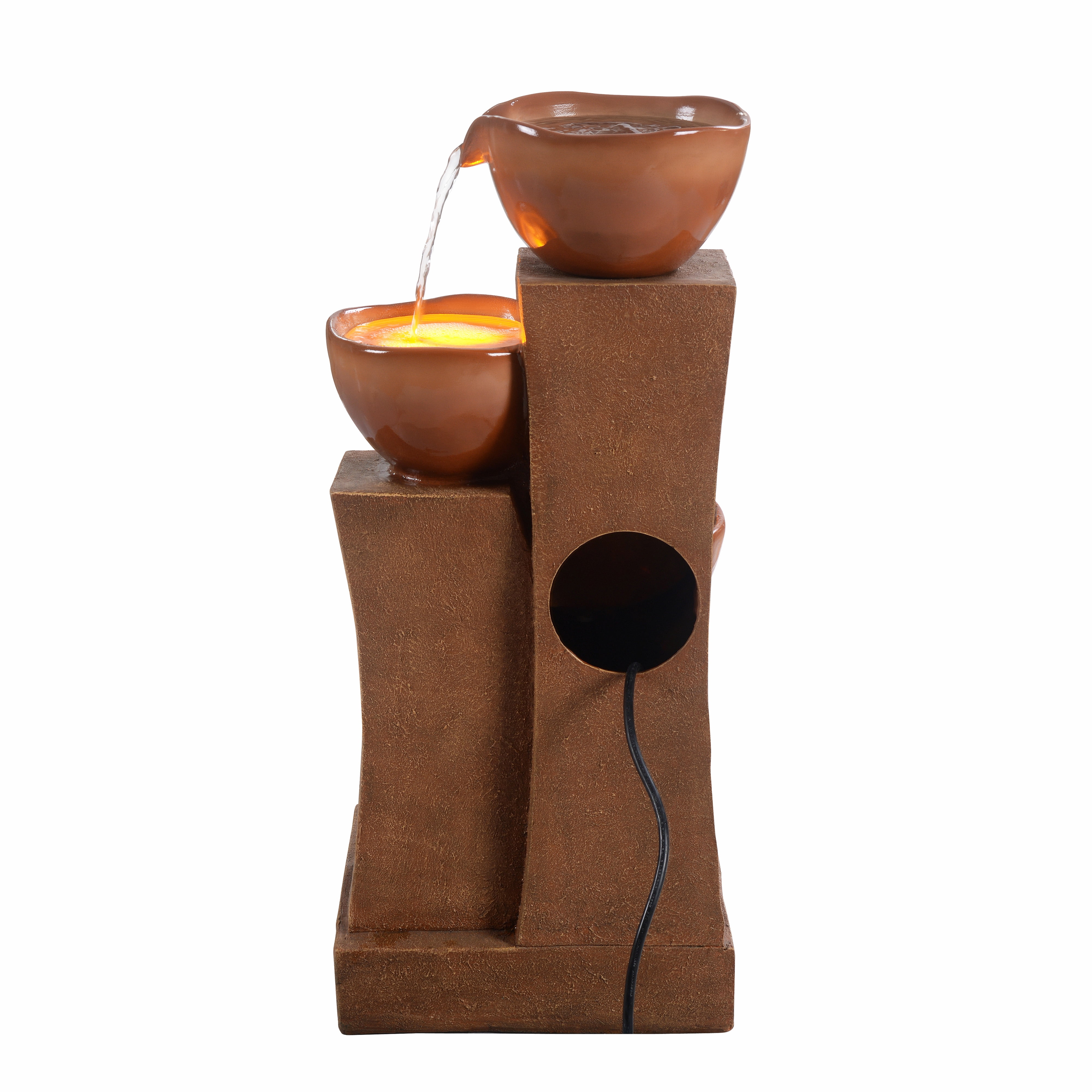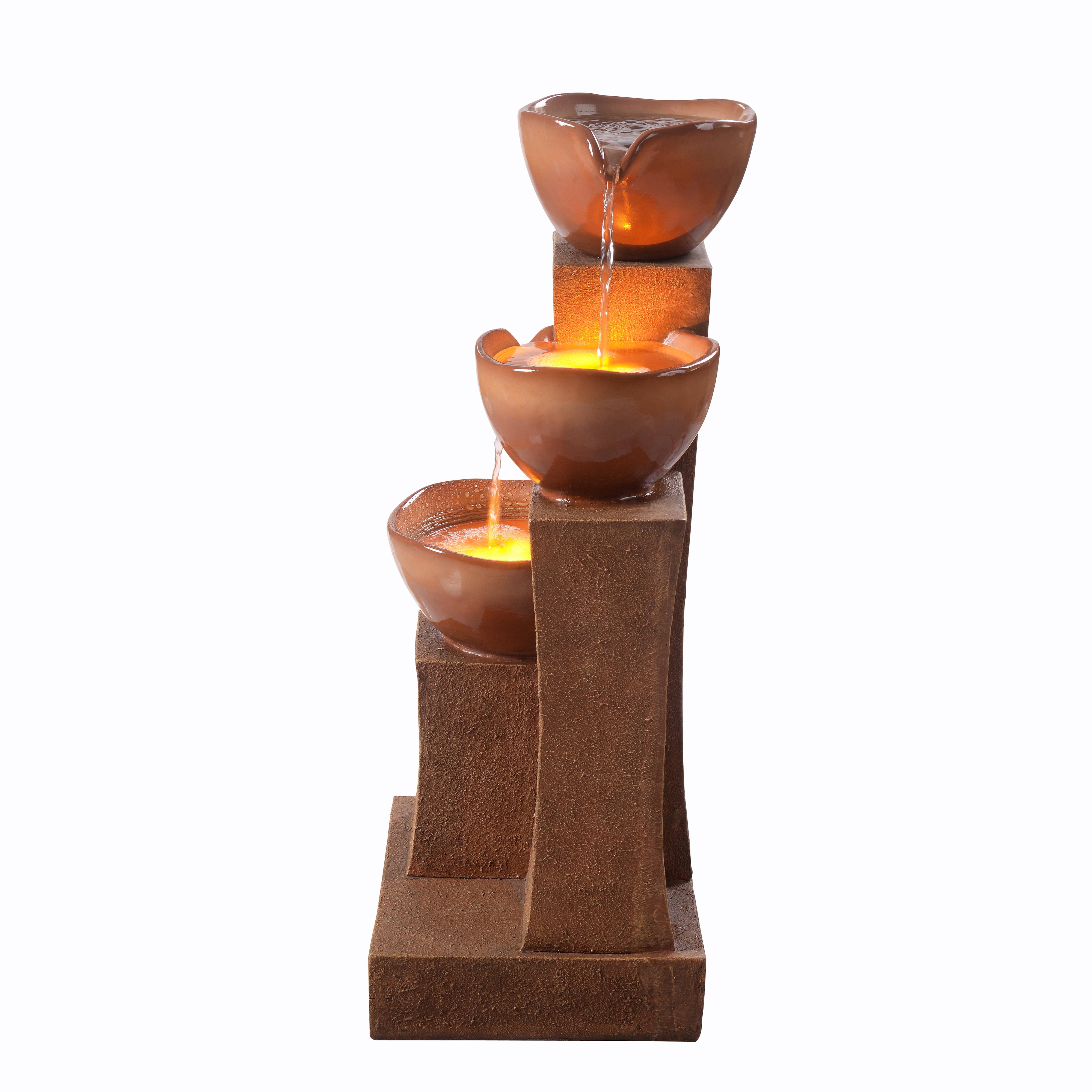Decorative, multi-textured 3-tier water fountain for outdoors or indoors Shiny brown ombre bowls staggered for soothing water sounds, illuminated from the below by LED lights Textured, staggered pedestals form a contemporary frame Includes an adjustable water pump with a 72.04″ cord and suction cups for secure, submersed placement Dimensions: 12.2″ L x 11.81″ W x 28.54″ H; Water Capacity: 2.1 gallons