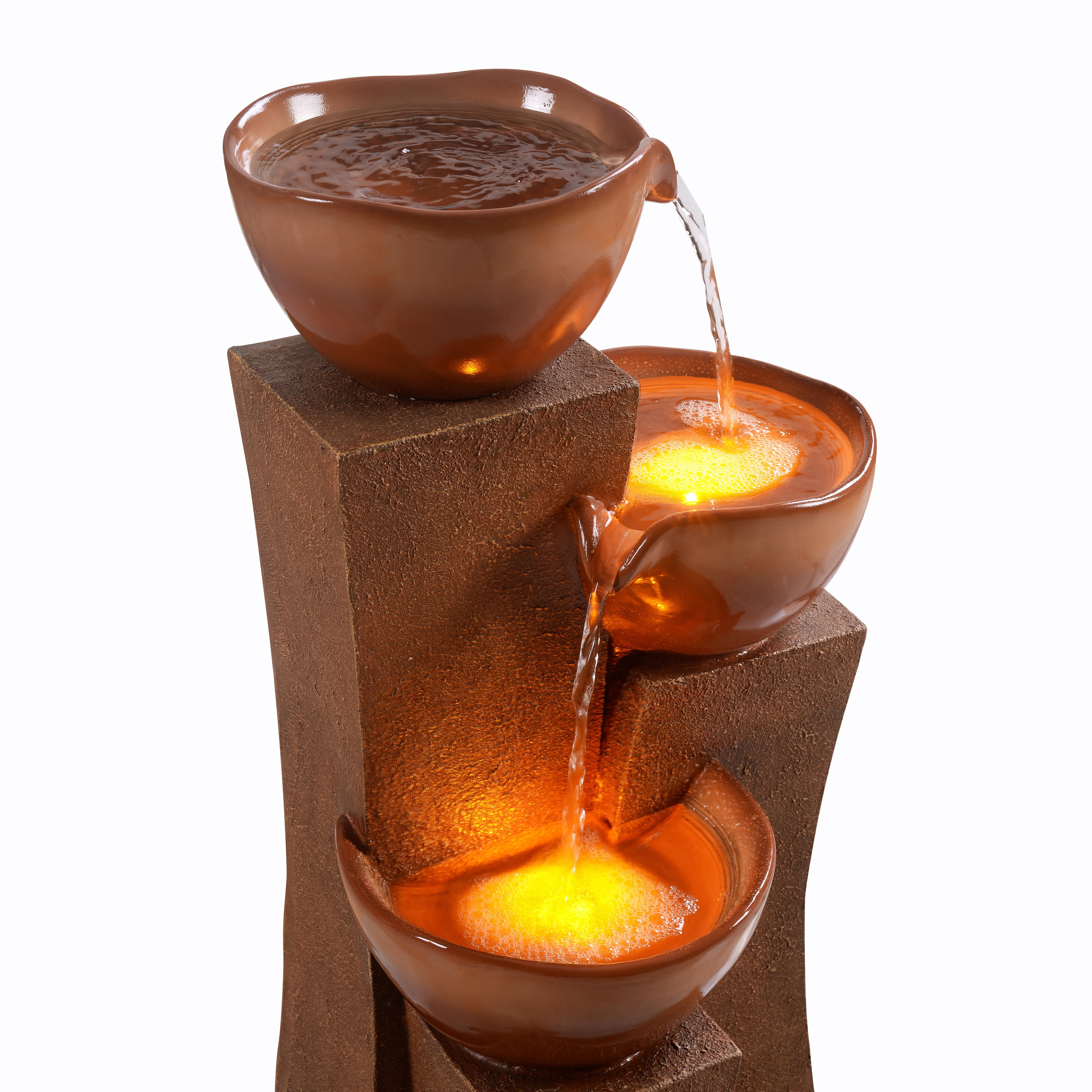 Teamson Home’s 3-Tier Cascading Outdoor Water Fountain is a decorative multi-textured water feature with three shiny warm brown ombre bowls supported by textured columns. Each bowl is illuminated by LED lights, creating a unique light effect in the trickling water. Made of sturdy polyresin and stone powder, this decorative water fountain is a great accent to patios, decks, gardens, and other outdoor living spaces. Or create a soothing, spa-like environment in offices or lobbies.