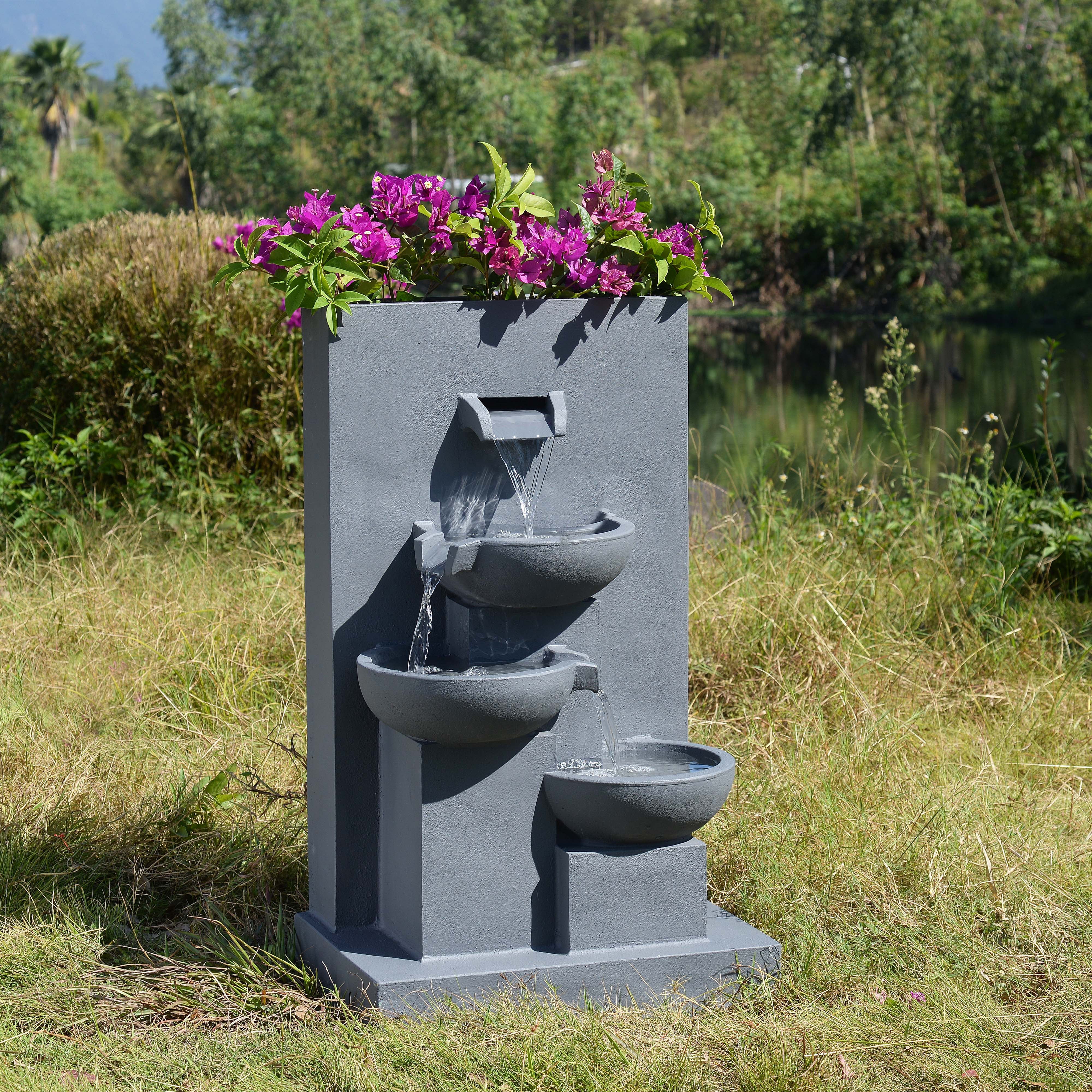 Add the gentle sound of trickling water to the ambiance of your home or office with the Teamson Home 3-Tier Cascading Outdoor Water Fountain with Planter. This decorative addition features a trio of staggered vessels, each illuminated by LED lights for a unique effect under the water. This 3.5-gallon water feature also includes a planter to add annuals or a houseplant for some color. (Plants not included.) Made of a sturdy combination of polyresin and stone powder in a smooth, gray finish that withstands the elements.
