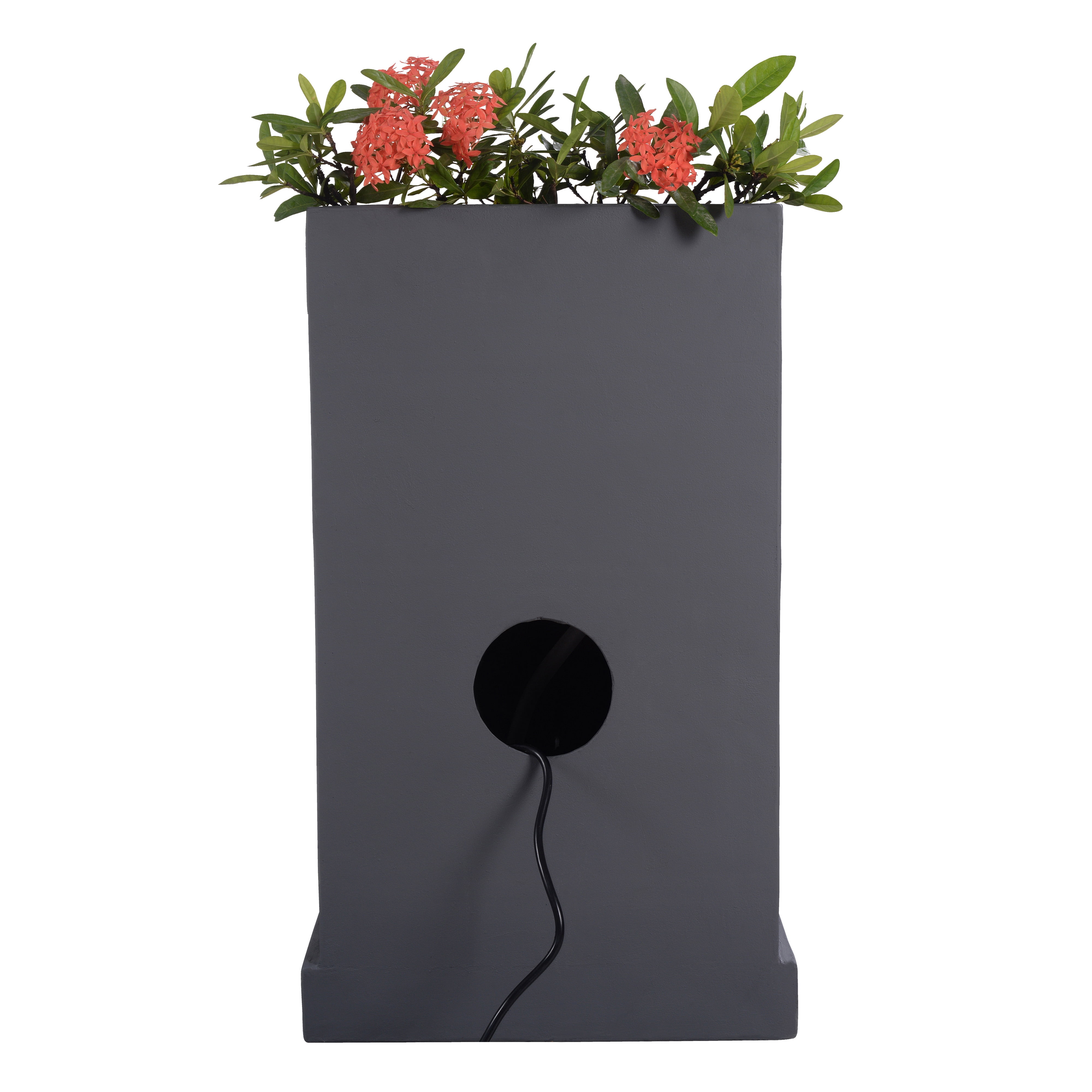Decorative 3-tier water fountain in a smooth gray finish, each tier is illuminated by LED lights Planter on top of the water feature for annuals or houseplants (plants not included) Weatherproof, rust-resistant polyresin body becomes a focal point, a decorative piece in landscaping Includes an adjustable water pump with a 72.04″ cord and suction cups for secure, submersed placement Dimensions: 17.32″ L x 12.4″ W x 29.13″ H; Water Capacity: 4.2 gallons