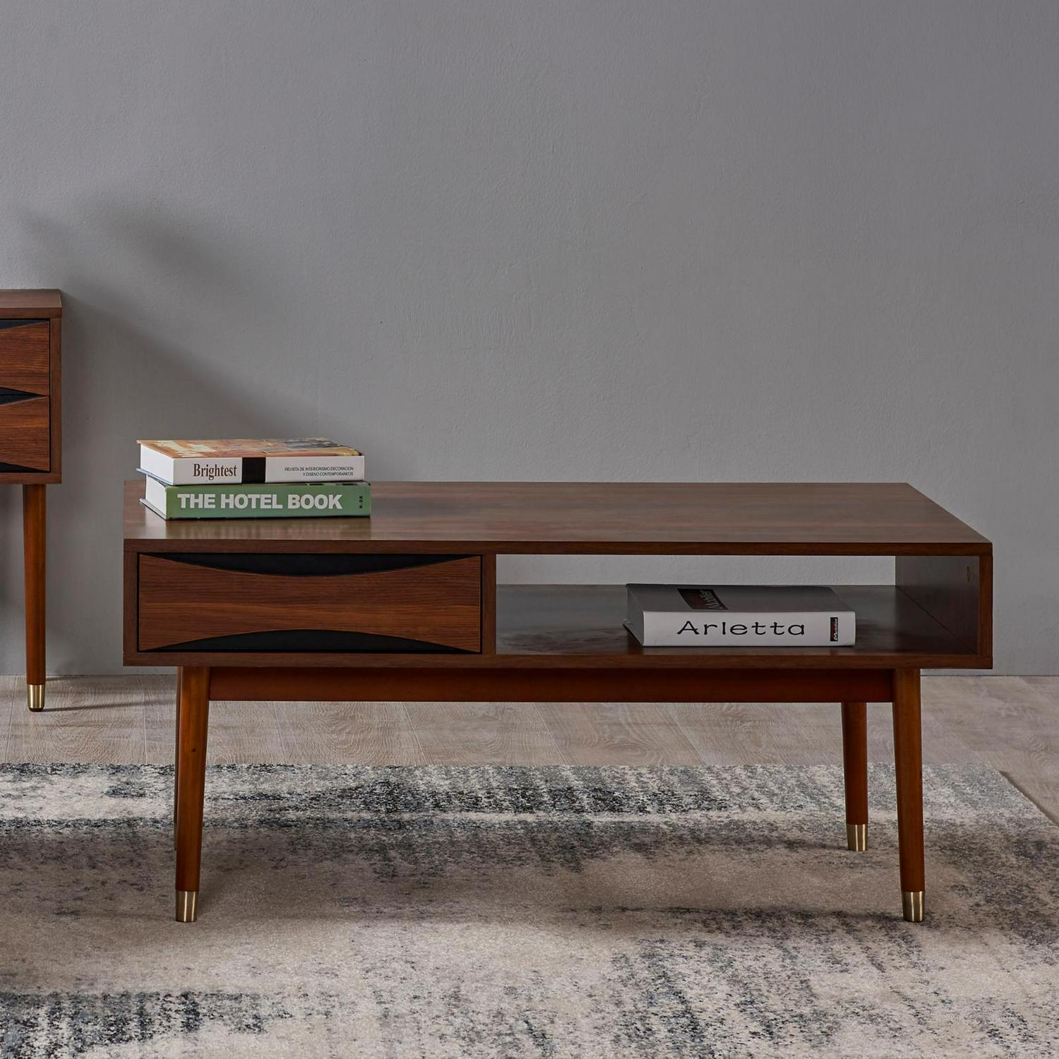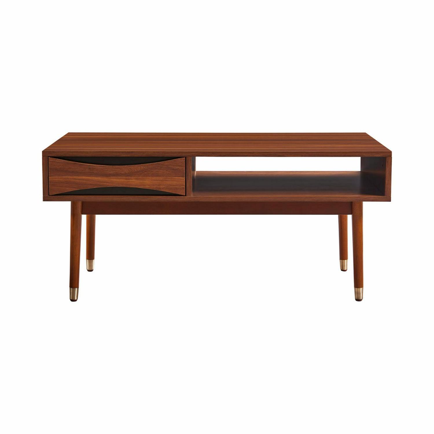 – Stylish coffee table: features a rectangular design complete with a brass-tipped legs and a walnut wood finish for an elegant addition to your home’s den or living room