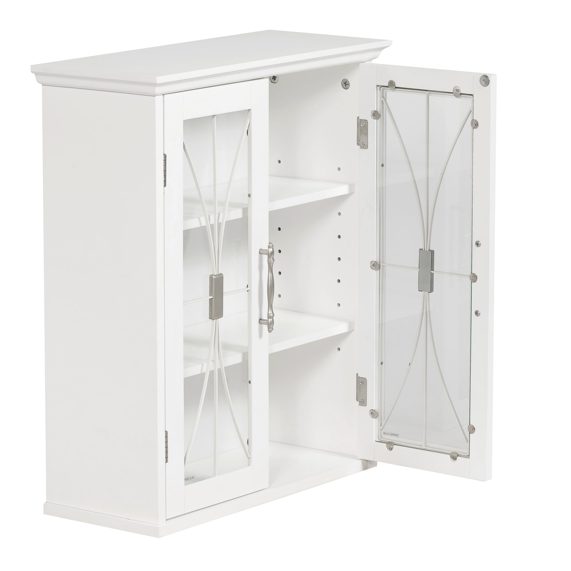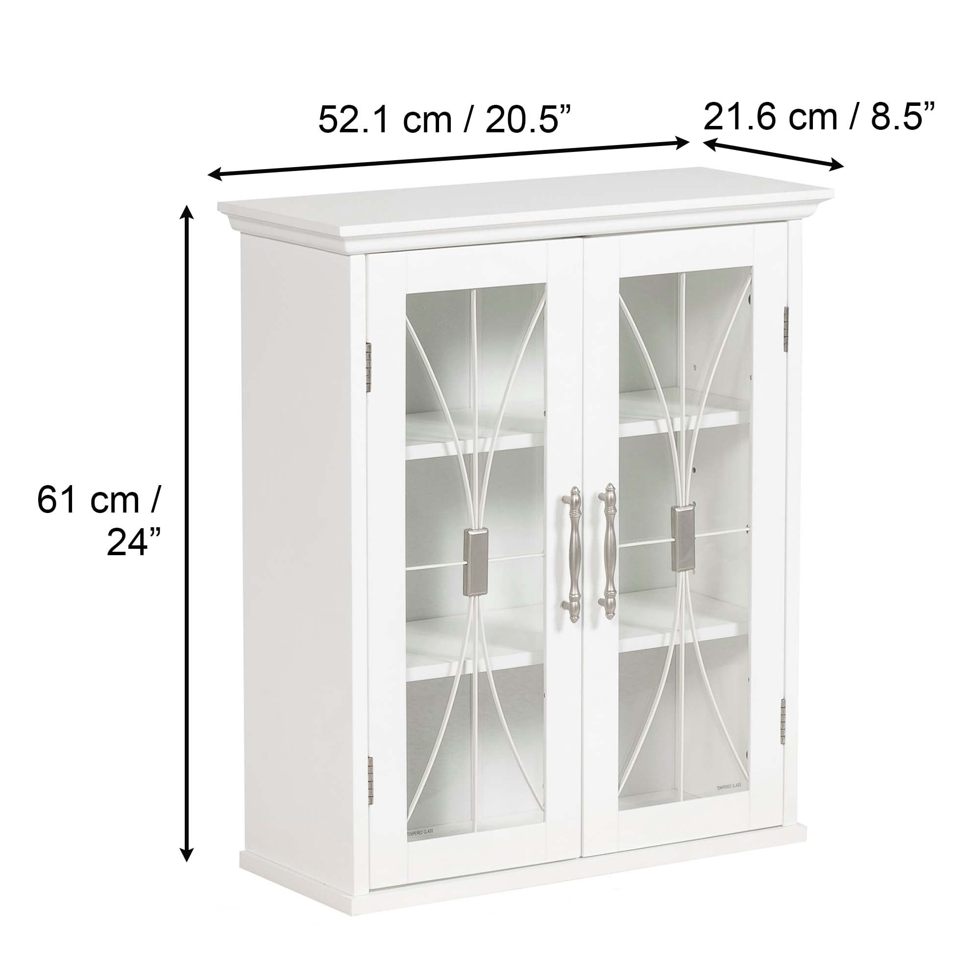 STYLISH CABINET: Features a white finish with a crown molded top, cathedral-style wire detail on the tempered glass-paneled doors, and metal knobs for a beautiful addition to your space. ADJUSTABLE STORAGE: Includes 2 adjustable interior shelves to help reduce clutter and keep your home tidy. DURABLE DESIGN: Constructed from durable engineered wood to provide long-lasting use. REMOVABLE: The cabinet does not have to be permanently mounted. It can be easily removed from the wall without tools if you need to move or reposition it later on. All hardware needed are included. Safety tested for up to 40 lbs of weight. EFFICIENT SIZE: Measures 8.5″ x 20.5″ x 24″ to provide removable storage without taking up too much space in your living area.