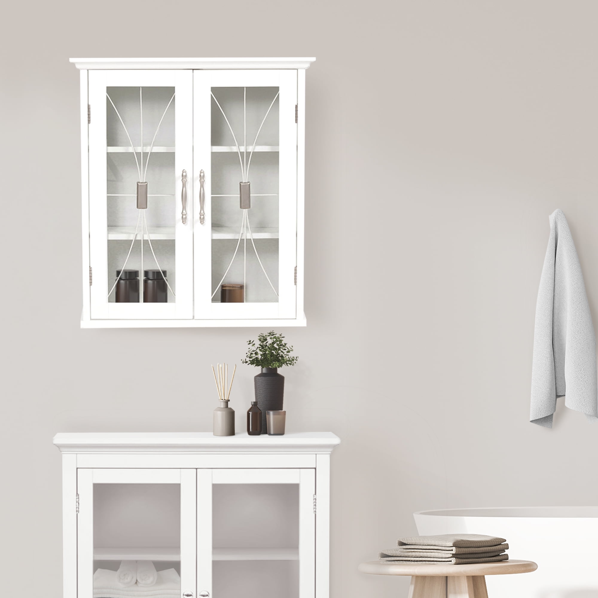 Upgrade your home storage while adding classic decor with the Teamson Home Delaney Wooden Wall Cabinet with 2 Doors. This decorative cabinet features a white finish with a crown molded top, cathedral-style wire detail on the tempered glass-paneled doors, and metal knobs for a beautiful addition to your space. The 2 included adjustable shelves help to reduce clutter and keep your home tidy. Constructed from durable engineered wood, this wall cabinet is built to provide you with long-lasting organization. Easy, step-by-step instructions and all of the hardware needed for installation are included for quick assembly. Purchase this stylish cabinet alone or with other items from the Delaney collection for a cohesive, updated look. The Teamson Home Delaney Wooden Wall Cabinet with 2 Doors measures 8.5″ x 20.5″ x 24″ to provide accessible storage without taking up too much space in your living area or bathroom.