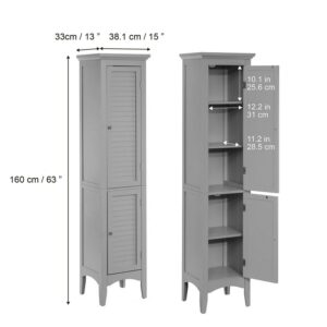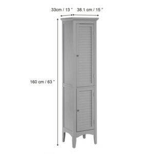 Upgrade your home storage while adding classic style with the Teamson Home Glancy Wooden Linen Tower Cabinet with Storage. This decorative cabinet features a timeless gray finish with a crown molded top and skirting, chrome-finished knobs, louvered doors, and shaker-style legs for a beautiful addition to your space. The 2 fixed and single adjustable included shelves make this cabinet functional and customizable to suit your storage needs. Constructed from durable engineered wood, this storage unit is built to provide you with long-lasting organization. Easy, step-by-step instructions and all of the hardware needed for installation are included for quick assembly. Purchase this stylish linen cabinet alone or with other items from the Glancy collection for a cohesive, updated look. The Teamson Home Glancy Wooden Linen Tower Cabinet with Storage measures 15″ x 13″ x 63″ to provide accessible storage without taking up too much space in your living area or bathroom.