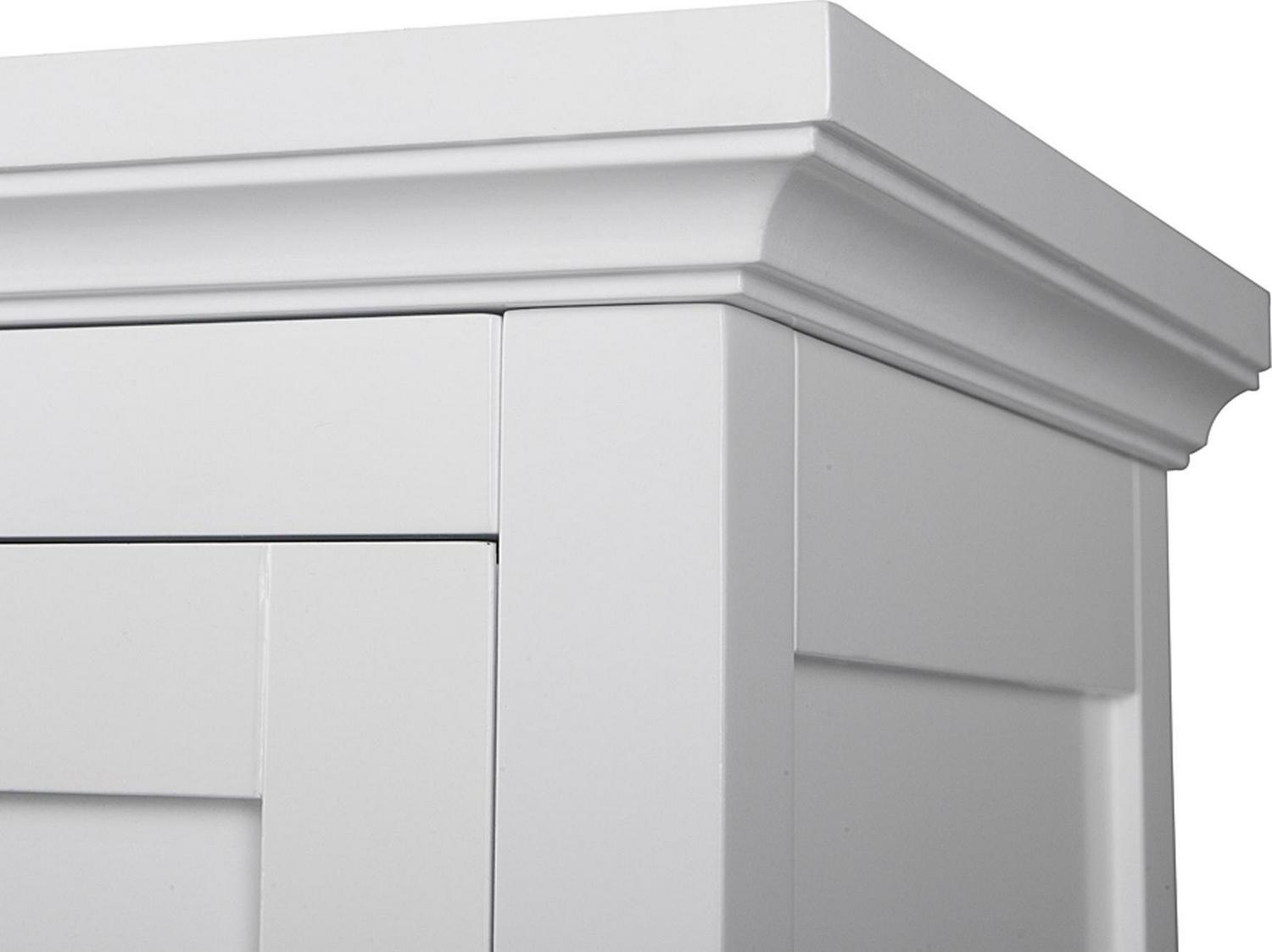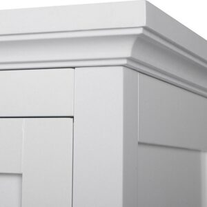 – STYLISH CABINET: Features a timeless white finish with a crown molded top and skirting, chrome-finished knobs and louvered doors for a beautiful addition to your space.