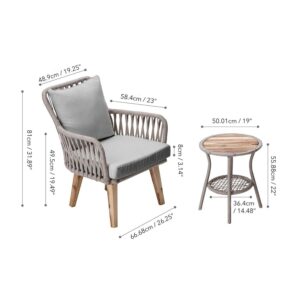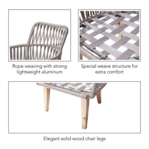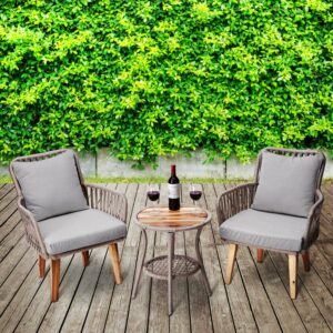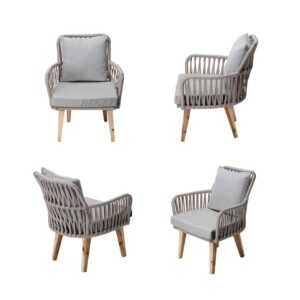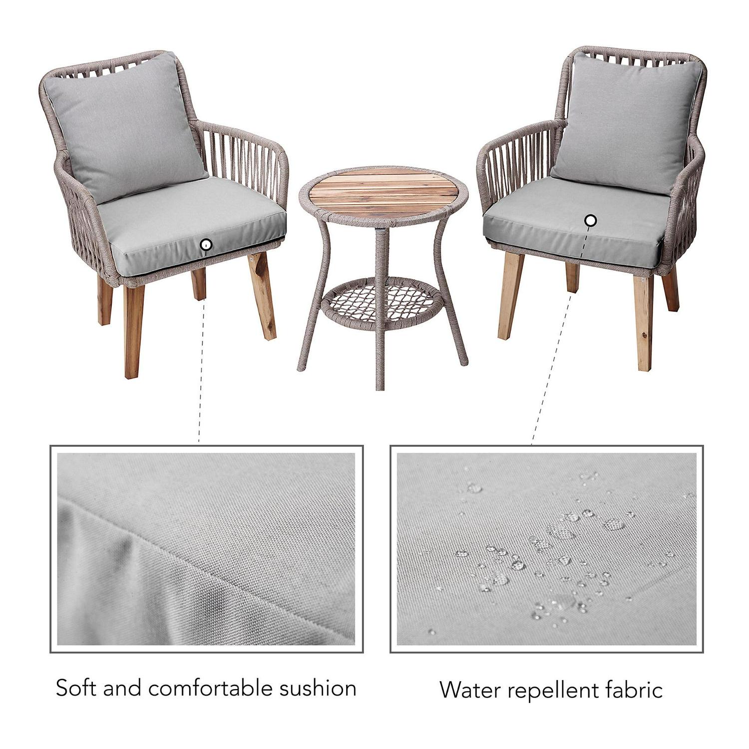 – OPEN-AIR RELAXATION IN STYLE: Clink glasses in the evening or enjoy coffee in the morning with a loved one in chic modern style with this patio bistro set by Teamson Home. Gray rope accents completely revitalize the classic silhouette of its two armchairs, artistically contrasting with its natural wood legs and tabletop.