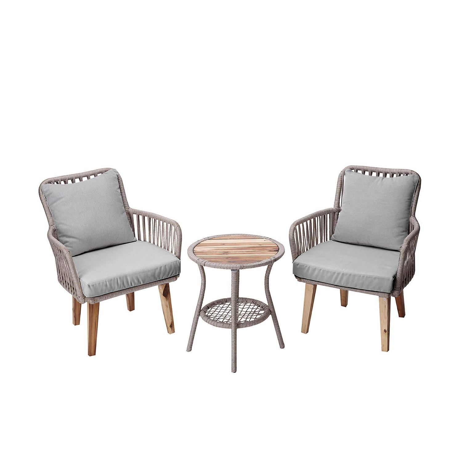 Clink glasses in the evening or enjoy coffee in the morning with a loved one in chic modern style with this patio bistro set by Teamson Home. Gray rope accents completely revitalize the classic silhouette of its two armchairs, artistically contrasting with its natural wood legs and tabletop. Its portable and lightweight design makes moving the conversation from one end of the patio to the other or storing away during the off-season absolutely effortless. Includes two matching armchairs and one end table with a built-in shelf, expertly crafted of weather-resistant materials for long-lasting comfort and style.