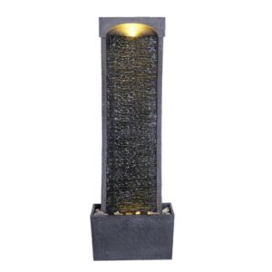 Turn your home’s indoor or outdoor area into a relaxing oasis with the Teamson Home Indoor/Outdoor Modern Curved Slate Waterfall Fountain with LED Lights. This decorative waterfall fountain features natural slate ledgestone in a contemporary curved shape for a tranquil and soothing addition to your porch, backyard, or lawn. Constructed from durable polyresin with a natural look and realistic textures, the fountain is weatherproof and rust-resistant. The built-in LED lights keep this fountain illuminated to add a soft glow to your space. Relax to the sounds of the water flow as it trickles down from the top of the waterfall to the pebbled stone basin below for a peaceful escape. For convenient setup, the fountain includes a pump and all necessary parts for installation without the need to purchase additional hardware. This outdoor fountain measures 13″ x 8″ x 37.75″ to easily fit in almost any outdoor space.