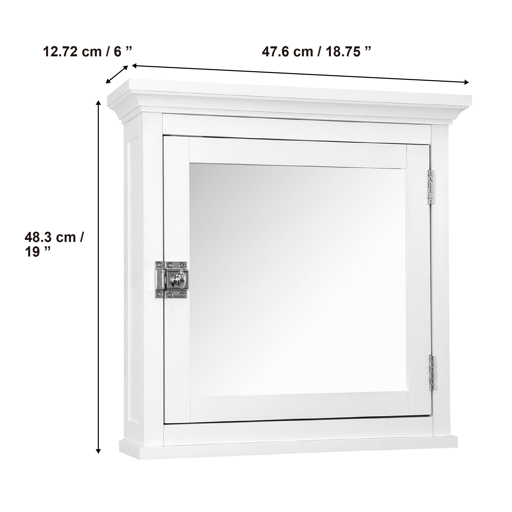 STYLISH CABINET: Features a white finish with a crown molded top, a mirrored glass door, and chrome knobs for a beautiful addition to your space ADJUSTABLE STORAGE: Includes an adjustable interior shelf to help reduce clutter and keep your home tidy DURABLE DESIGN: Constructed from durable engineered wood to provide long-lasting use SIMPLE CONSTRUCTION: Easy, step-by-step instructions and all of the hardware needed are included for quick assembly EFFICIENT SIZE: Measures 6″ x 18.75″ x 19″ to provide removable storage without taking up too much space in your bathroom