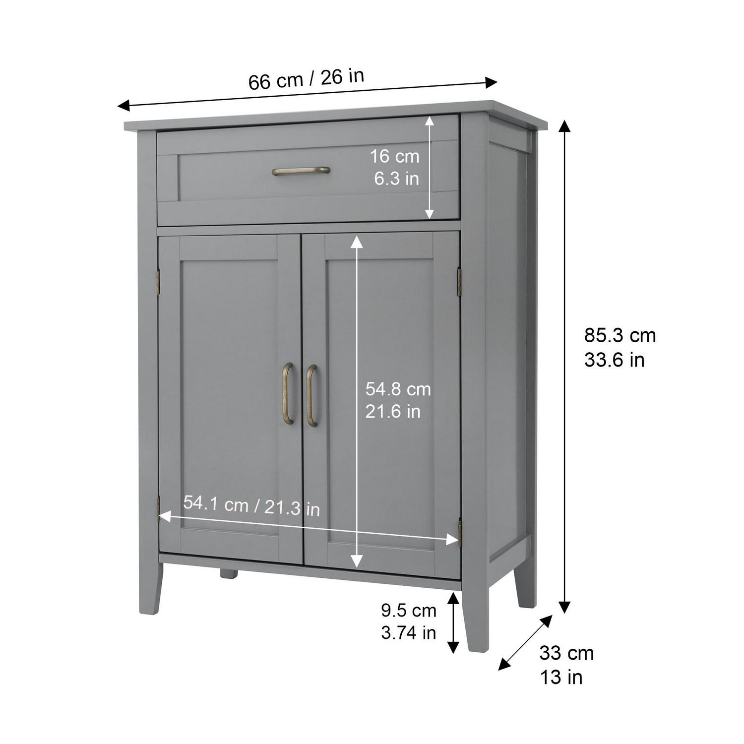 Upgrade your home storage while adding mid-century modern decor with the Teamson Home Mercer Mid Century Modern Wooden Floor Cabinet. This decorative cabinet features a gray finish with double doors and brass pulls for an elevated and stylish addition to your space. The interior adjustable shelf and top drawer provide ample storage and help to reduce clutter, and its versatile design can be used in the bathroom, living room, or in any room around the home. Constructed from durable engineered wood, this floor cabinet is built to provide you with long-lasting organization. Easy, step-by-step instructions and all of the hardware needed for installation are included for quick assembly. Purchase this stylish cabinet alone or with other items from the Mercer collection for a cohesive, updated look. The Teamson Home Mercer Wooden Floor Cabinet with Drawer and 2 Doors measures 13″ x 26″ x 33.6″ to provide accessible storage without taking up too much space in your living area or bathroom.