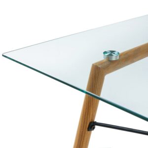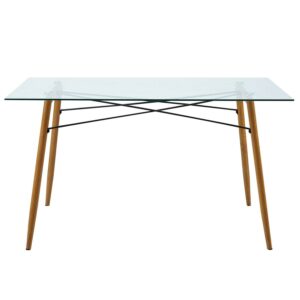 Create a minimalist atmosphere in your home’s dining area with the Teamson Home Minimalist Glass Top Dining Table with Wood Base. Featuring a contemporary design with a minimalist glass table top and a natural base with tapered wood legs and black supports, this modern table is a stylish update to any dining space. The tempered glass top of this dining table is durable and scratch resistant to stay looking great over time. Included leg levelers make sure this table has a stable surface regardless of the space it’s in for safe, dependable use. Purchase this kitchen table on its on own or with our high-quality Minimalist dining chairs for a complete dining set. For quick and easy assembly, this table includes step-by-step instructions. Measuring 55.12″ x 31.5″ x 30″, the Teamson Home Minimalist Glass Top Dining Table with Wood Base provides plenty of space for dining without taking up too much room.