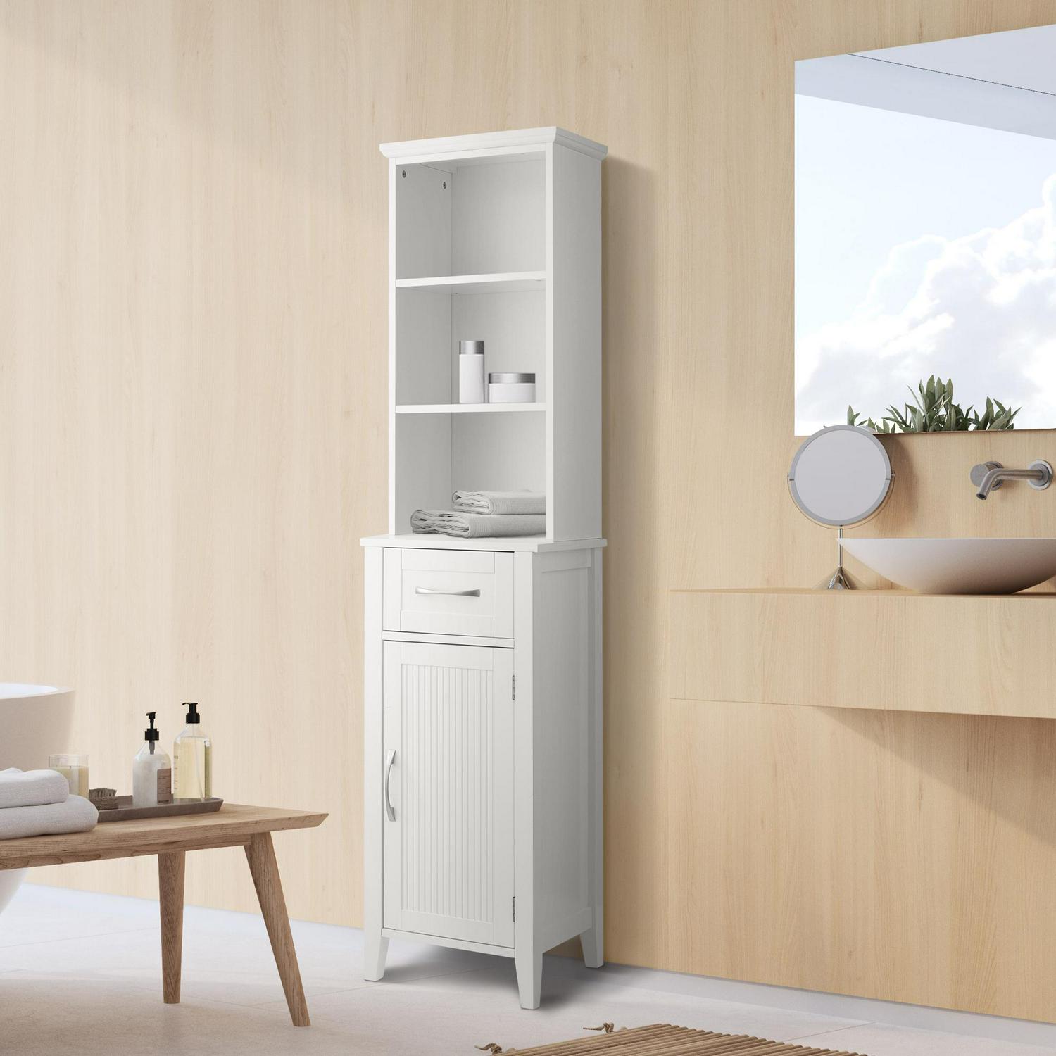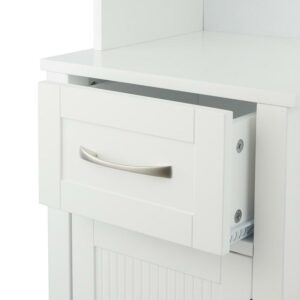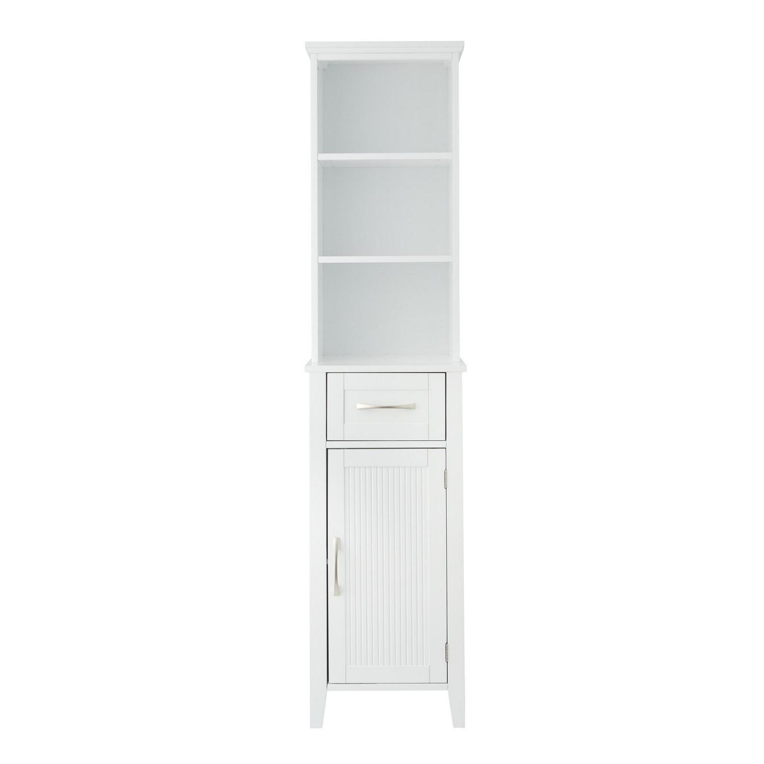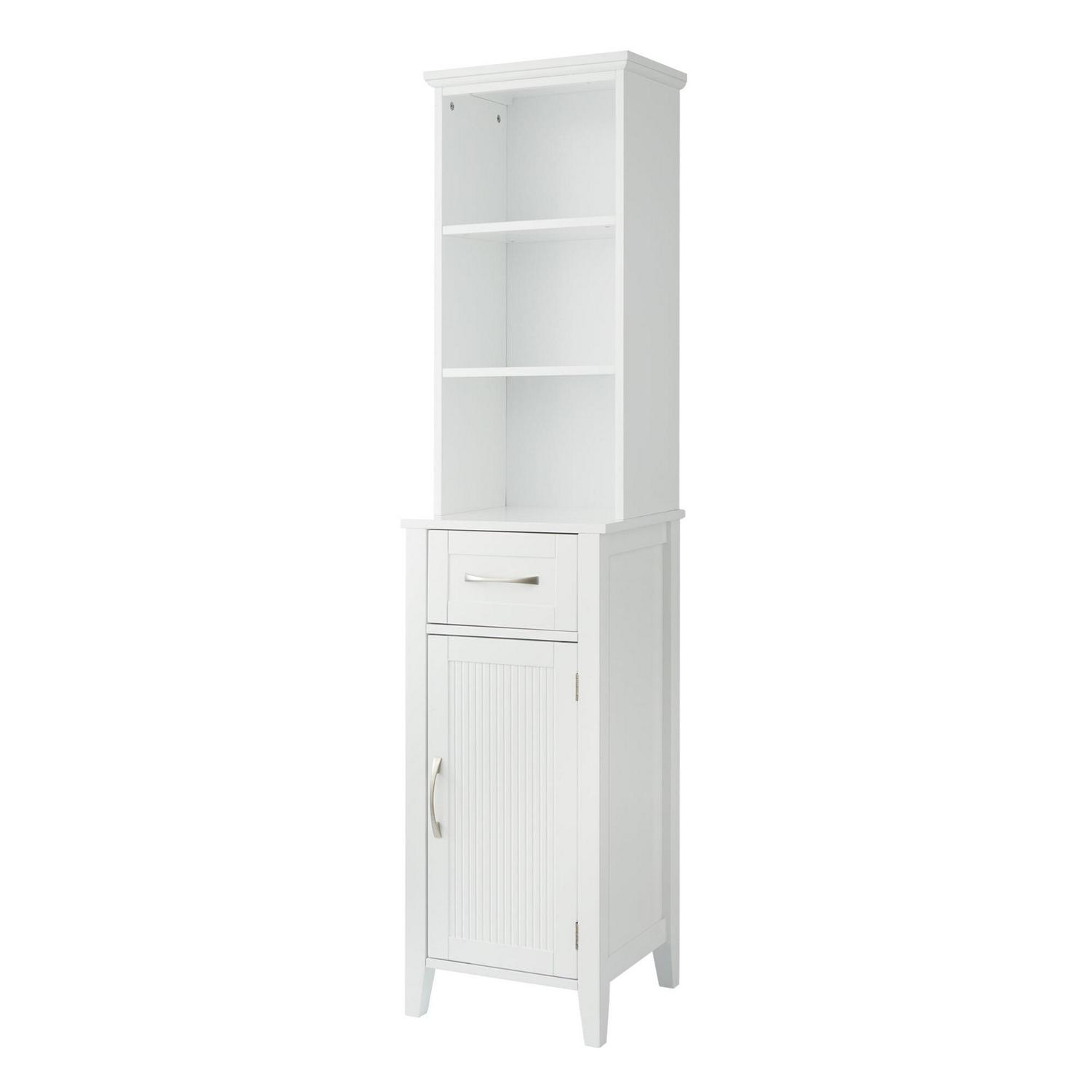 Upgrade your home storage while adding modern classic style with the Teamson Home Newport Contemporary Wooden Linen Tower Cabinet. This decorative cabinet features a white finish with flat beaded shaker door and brushed nickel pulls for an elevated and stylish addition to your space. The adjustable open shelves, middle drawer, and bottom cabinet provide storage for extra towels, linens, blankets, toiletries, and more to keep your home tidy. Constructed from durable engineered wood, this floor cabinet is built to provide you with long-lasting organization. Easy, step-by-step instructions and all of the hardware needed for installation are included for quick assembly. Purchase this stylish cabinet alone or with other items from the Newport collection for a cohesive, updated look. The Teamson Home Newport Wooden Linen Tower Cabinet with Open Shelving measures 13″ x 15″ x 63.2″ to provide accessible storage without taking up too much space in hallways or the bathroom.