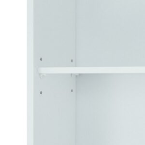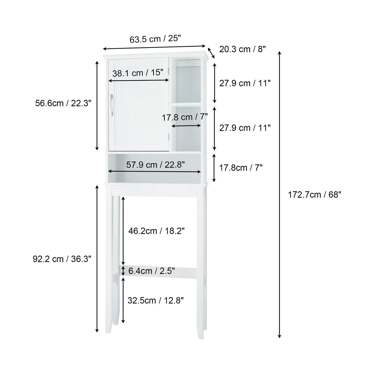 Upgrade your bathroom storage while adding modern classic style with the Teamson Home Newport Contemporary Wooden Over-the-Toilet Cabinet. This decorative space saver cabinet features a white finish with flat beaded shaker door and brushed nickel pull for an elevated and stylish addition to your space. The three open shelves and adjustable interior shelf provide storage for towels, toilet paper, toiletries, and more to help reduce clutter and keep your bathroom tidy. Constructed from durable engineered wood, this space saver is built to provide you with long-lasting organization. Easy, step-by-step instructions and all of the hardware needed for installation are included for quick assembly. Purchase this stylish cabinet alone or with other items from the Newport collection for a cohesive, updated look. The Teamson Home Newport Wooden Toilet Storage Cabinet with Open Shelving and 1 Door measures 8″ x 25″ x 68″ to fit over most standard toilets and provide extra storage in unused space in the bathroom.
