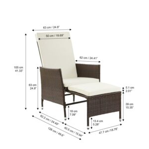 Teamson Home Outdoor Rattan Patio Lounge Chair with Pull-Out Ottoman and Cushions for Porches, Balconies, Backyards, Brown/White, 18.78 x 40.43 x 40.