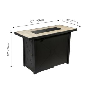 Bring warmth and timeless decor to your home’s outdoor area with the Teamson Home Outdoor Rectangular Propane Ceramic Gas Fire Pit with Steel Base. This ceramic gas fire pit features a modern look to add warmth and a calming atmosphere to your porch, deck, or yard. This fire pit is rated for 4 , BTUs and creates an ambient display as the green-burning flames dance across the included 8.8 lbs. of glass rocks. This gas fire pit’s integrated ignition, included hose, and easy controls provide hassle-free operation and installation. To protect your fire pit from the elements while it’s not in use or convert it into an outdoor dining table, a lid is included. Add one or more of these fire pits to your garden or patio to create a warm environment that turns your yard into an outdoor oasis. The Teamson Home Outdoor Rectangular Propane Ceramic Gas Fire Pit with Steel Base features a sturdy steel construction, preventing it from cracking or tipping even in harsh weather conditions. This fire pit measures 42″ long, 2 ” wide, and 28.75″ tall to provide a peaceful atmosphere without taking up too much space.