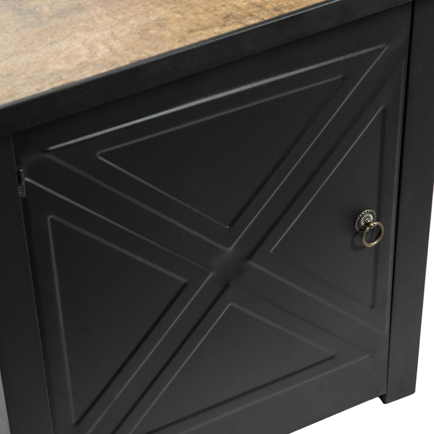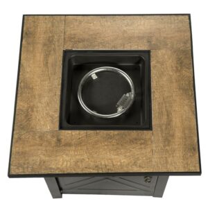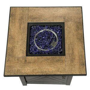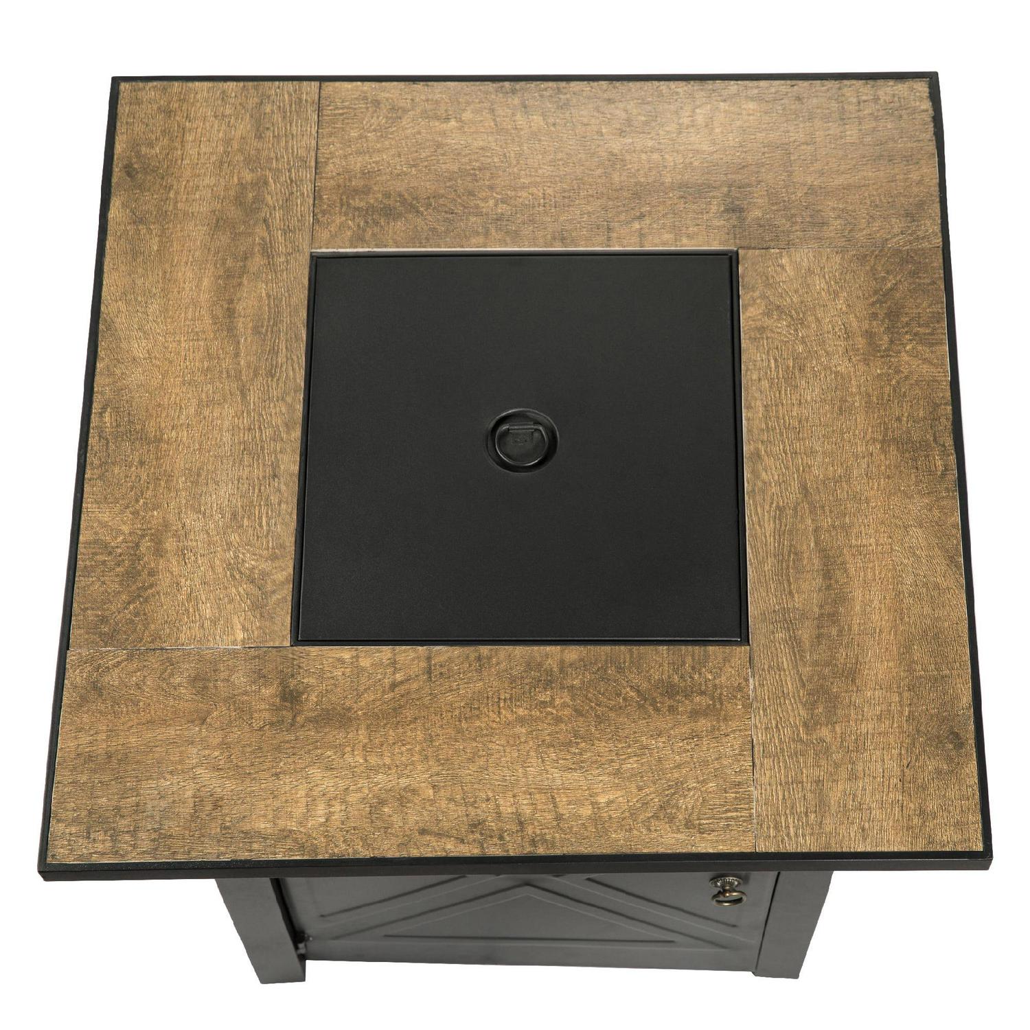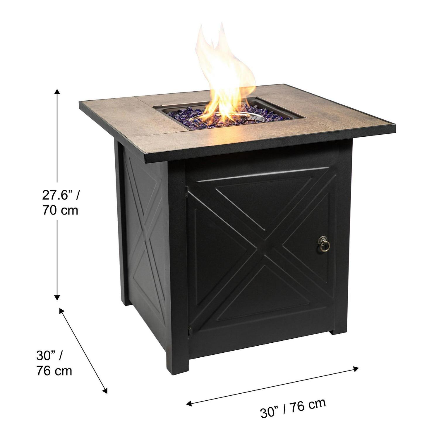This chic fire pit by Teamson Home takes inspiration from timeless Shaker furniture pieces, completely transforming classic charm for today s modern outdoor décor. The iconic etched cross accents on each side of its black base are beautifully updated in jet black, paired perfectly with the wood-look of its ceramic top. The built-in door at its base keeps unsightly gas tanks out of view. Comes complete with 20 gas hose, 8.8 lbs of glass rocks, and a lid to easily convert into a dining table when unlit.