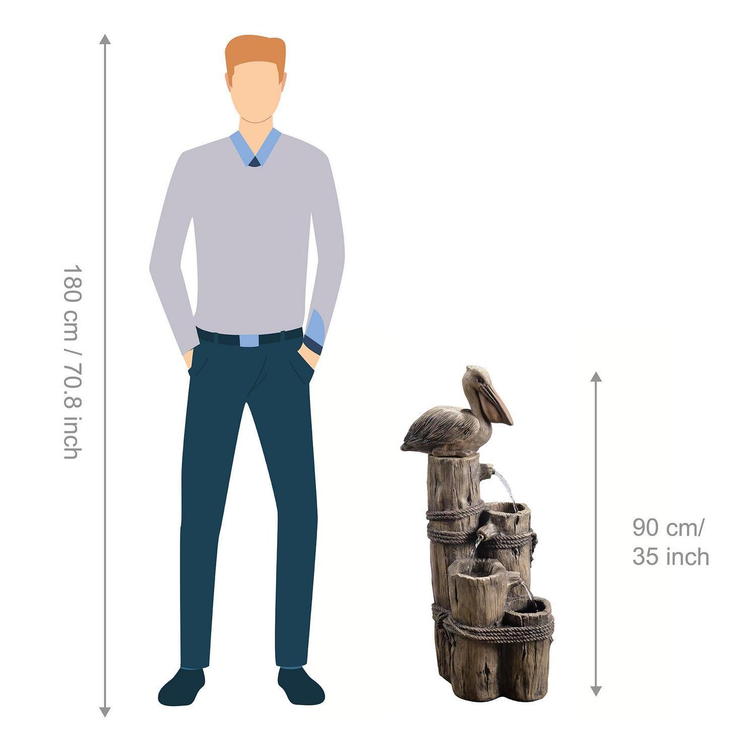 Add classic seaside charm to your home’s outdoor area with the Teamson Home Outdoor Tiered Pelican and Wooden Post Waterfall Fountain. This outdoor cascading fountain features 4 tiered posts topped with a friendly pelican for a timeless and soothing addition to your porch, backyard, or lawn. Constructed from durable resin with a natural look and realistic textures, the fountain is weatherproof, rust-resistant, and resilient. This rustic look of this outdoor fountain will bring a touch of nautical beauty to your space. Relax to the sounds of the peaceful water flow as it trickles down from the top post to the additional posts below for a peaceful escape. For convenient setup, the fountain includes a pump and all necessary parts for installation without the need to purchase additional hardware. This outdoor fountain measures 14.76″ x 11.42″ x 35.43″ to easily fit in almost any outdoor space while adding dimension and visual interest.