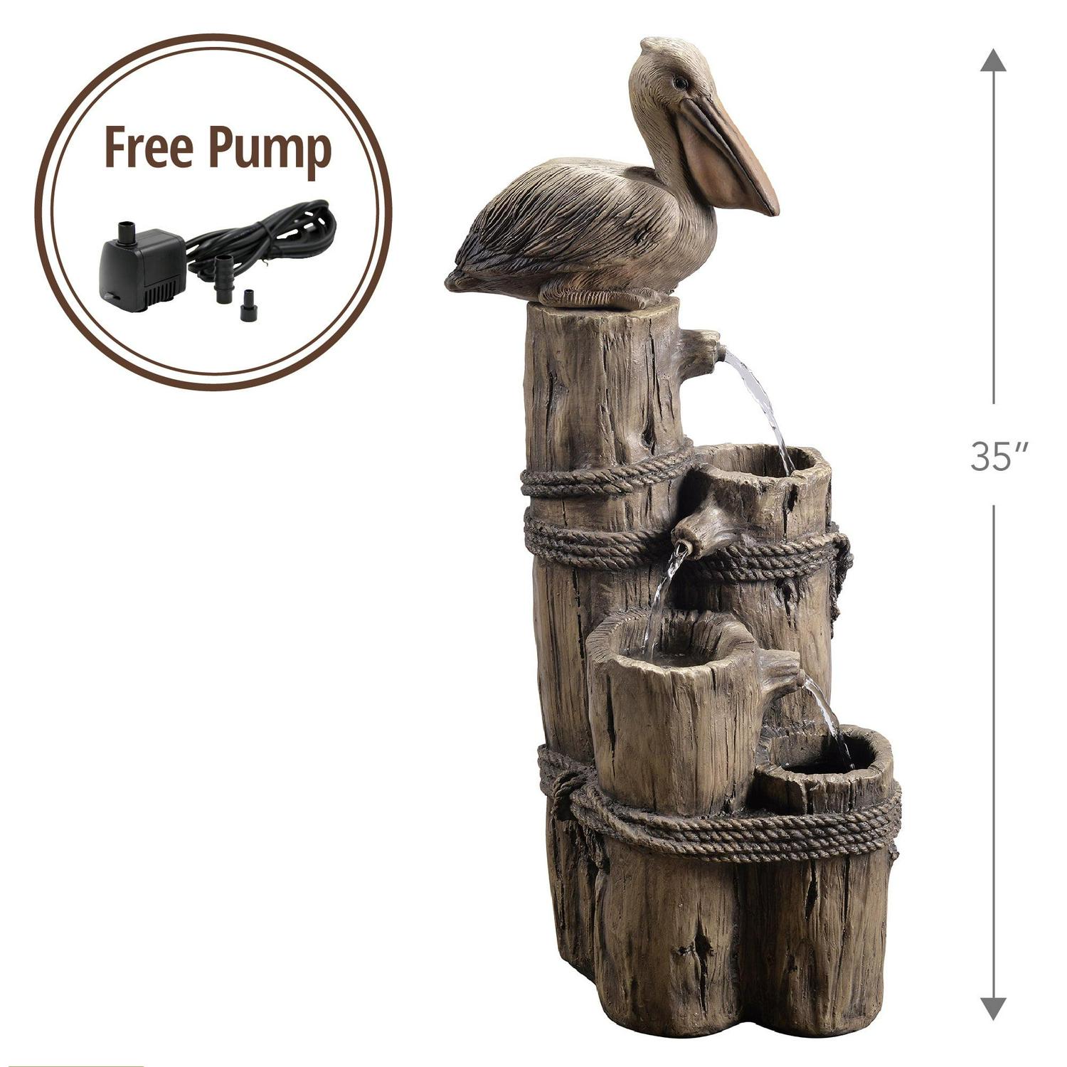 Teamson Home Outdoor Tiered Pelican and Wooden Post Waterfall Resin Fountain, Brown