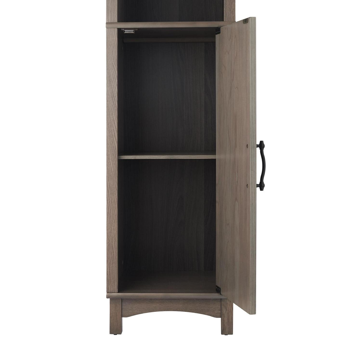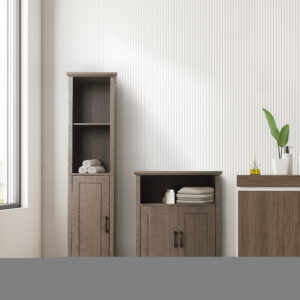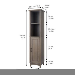 Upgrade your home storage while adding modern farmhouse decor with the Teamson Home Russell Modern Farmhouse Wooden Linen Tower Cabinet. This decorative cabinet features a rustic salt oak finish with paneled door and matte black pull for an elevated and stylish addition to your space. The adjustable open shelf and bottom cabinet provide storage for extra towels, linens, blankets, toiletries, and more to keep your home tidy. Constructed from durable engineered wood, this floor cabinet is built to provide you with long-lasting organization. Easy, step-by-step instructions and all of the hardware needed for installation are included for quick assembly. Purchase this stylish cabinet alone or with other items from the Russell collection for a cohesive, updated look. The Teamson Home Russell Wooden Linen Tower Cabinet with Open Shelving measures 13″ x 15″ x 62.75″ to provide accessible storage without taking up too much space in hallways or the bathroom.