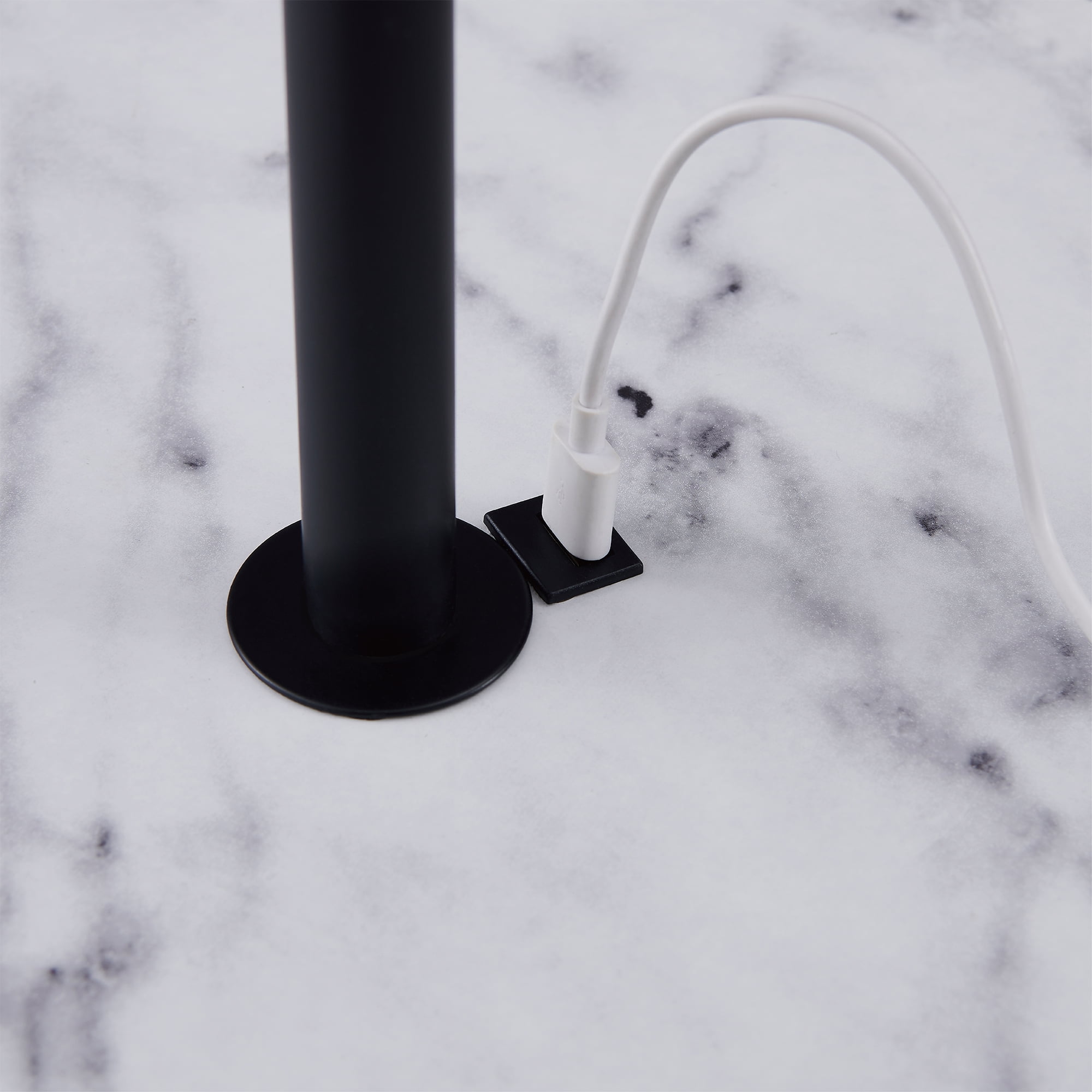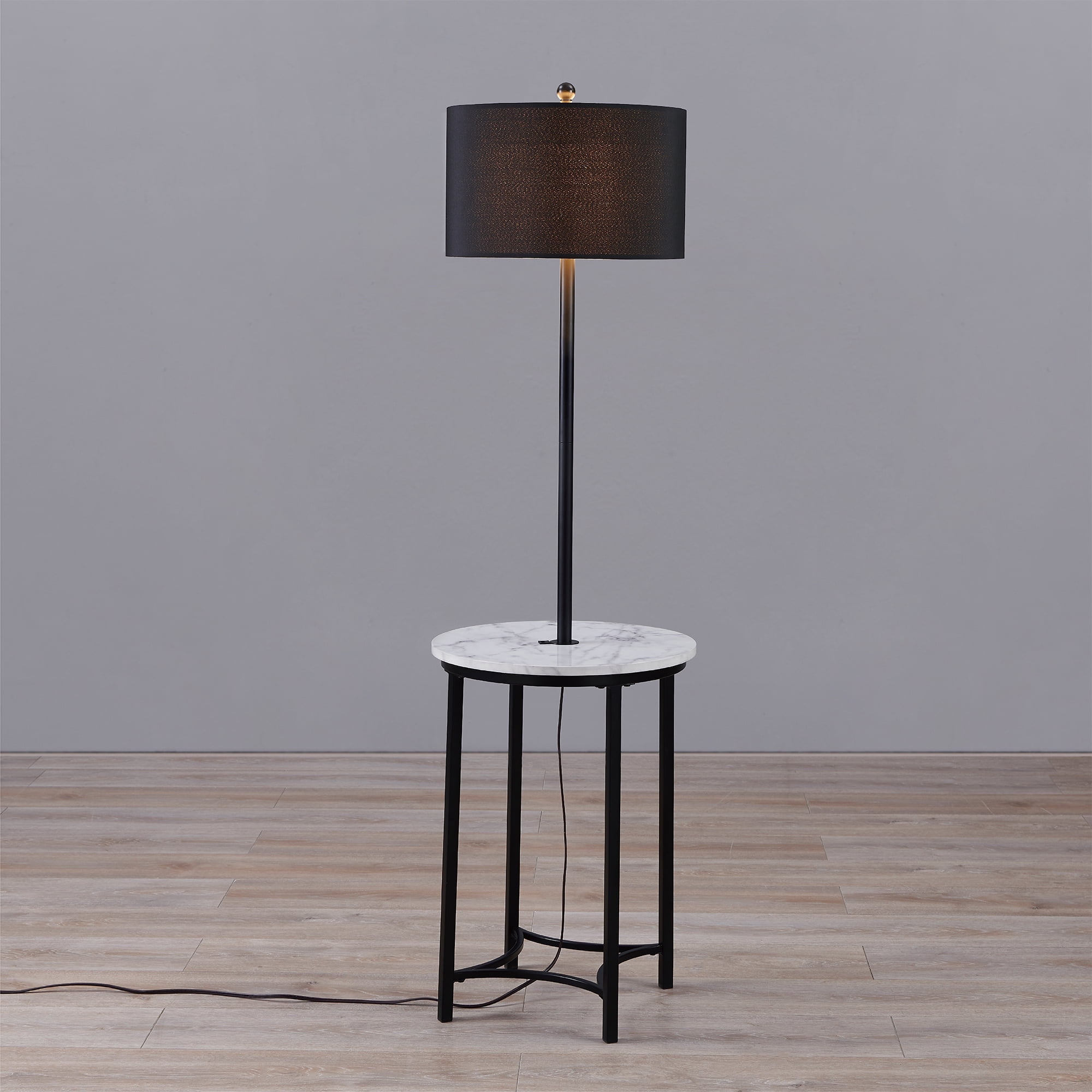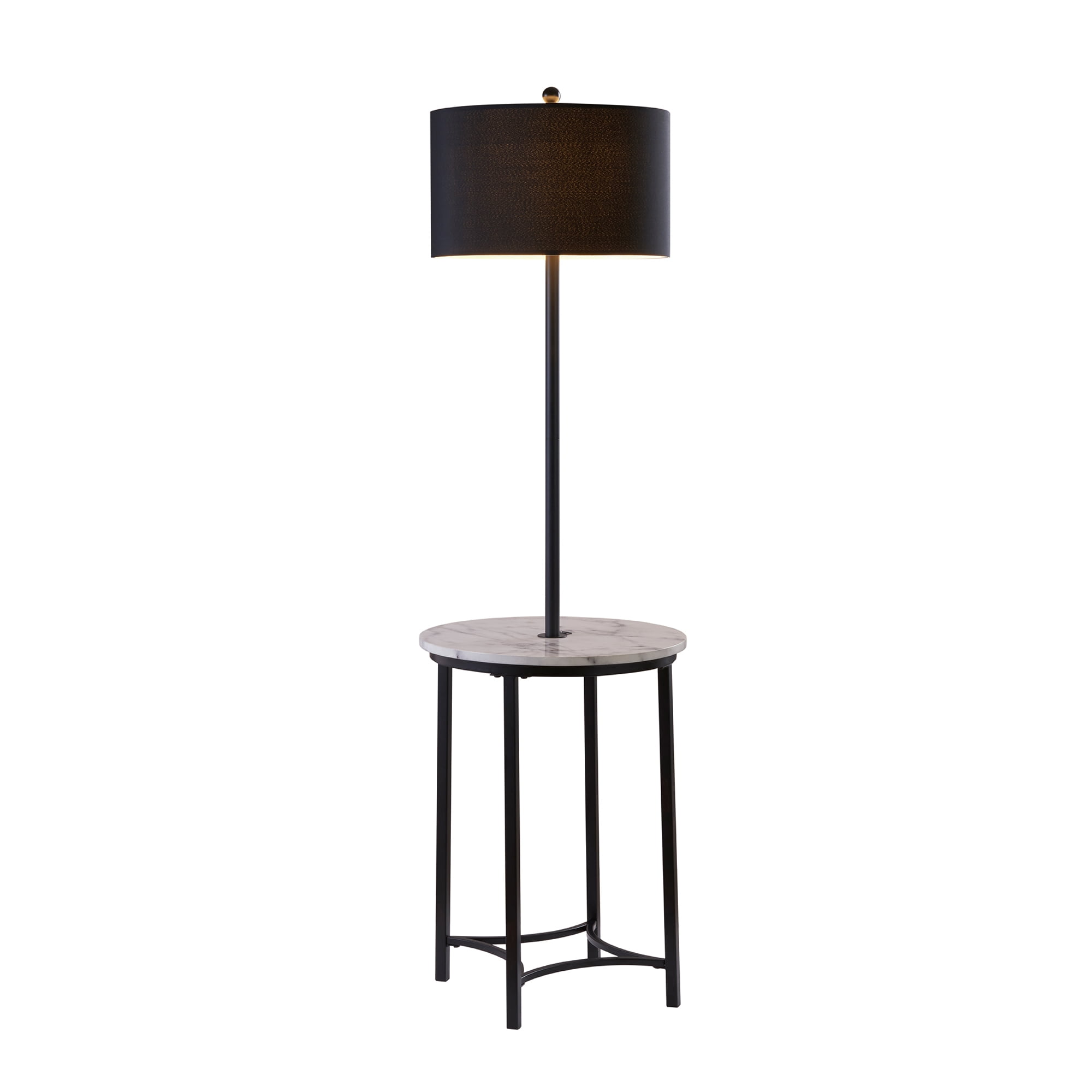 Illuminate your space while adding a functional surface with the Teamson Home Shenna Floor Lamp with Table and Built-In USB. This table and lamp combination features a metal base with a black finish, a black drum shade, and a faux marble tabletop for a modern addition to your bedroom or living space. This side table also includes a built-in USB port right next to the lamp to keep your devices charged and within reach. Constructed from durable materials, this lamp is built for long-lasting use. Purchase this table and lamp alone or with a high-quality Teamson accent chair to complete your reading nook. For easy assembly, step-by-step instructions are included. The Teamson Home Shenna Floor Lamp with Table and Built-In USB measures 17.75″ x 17.75″ x 61.5″ to fit easily into most spaces. Lightbulb not included.