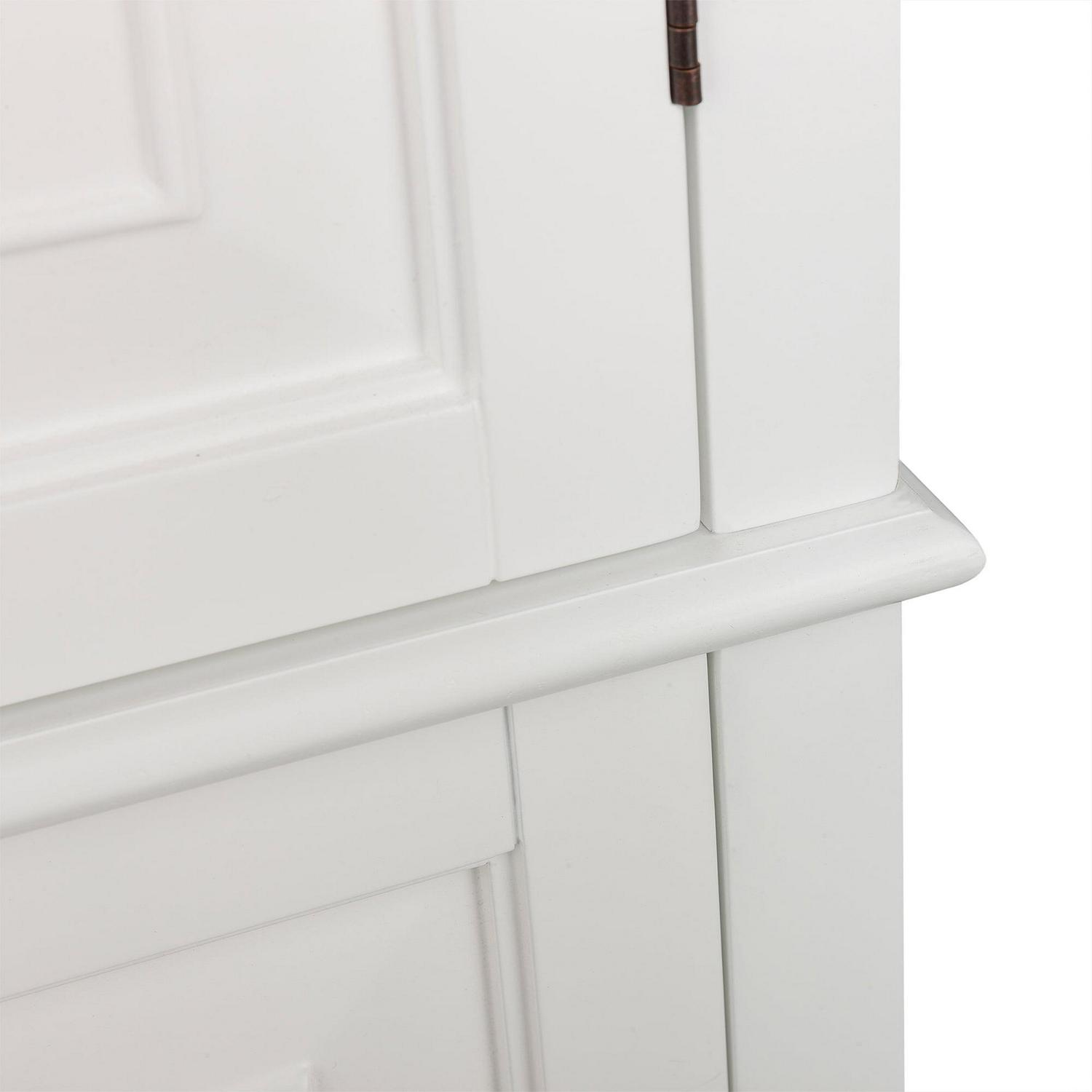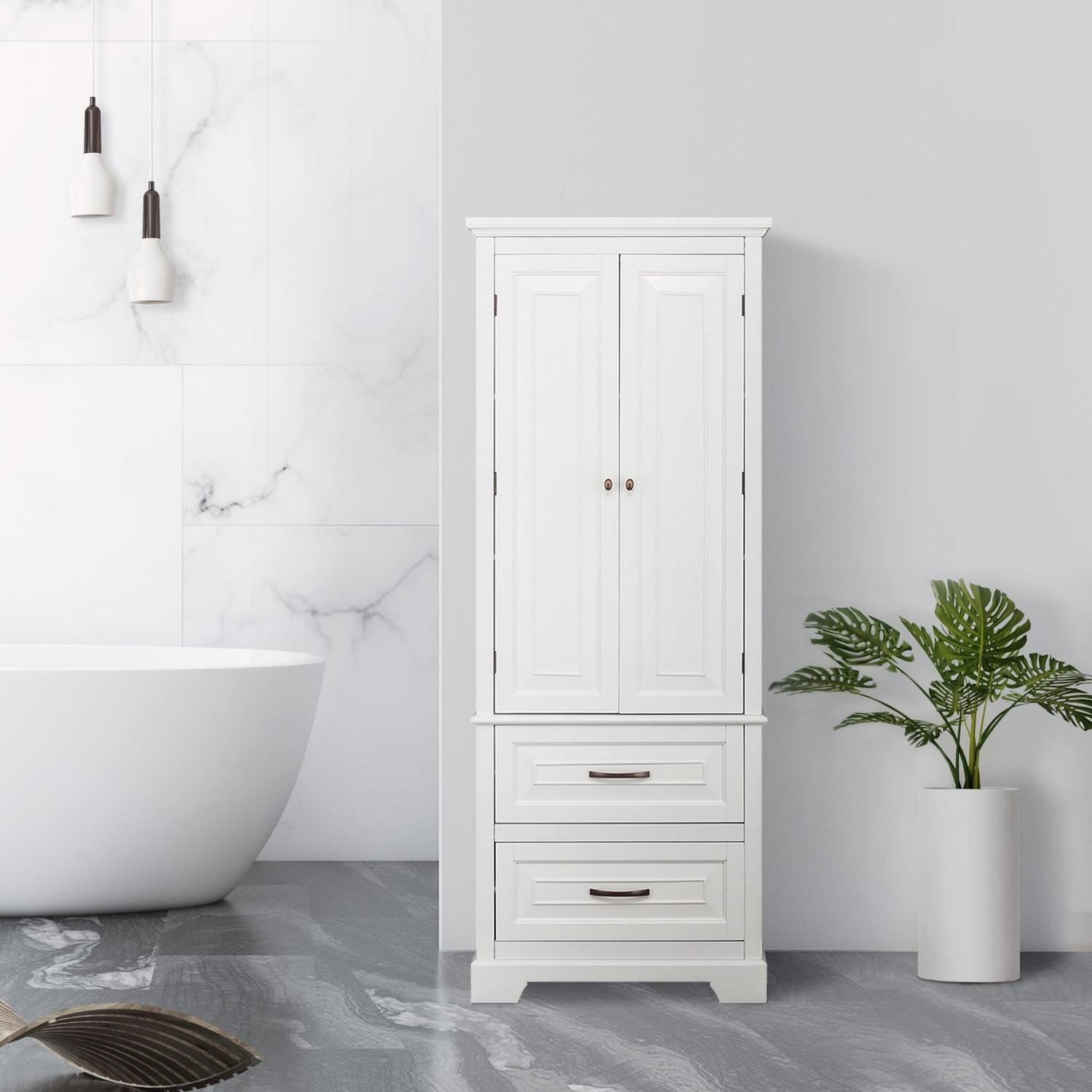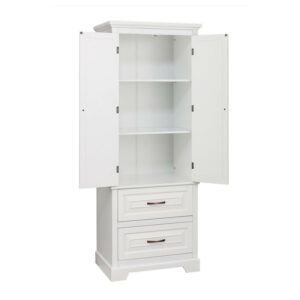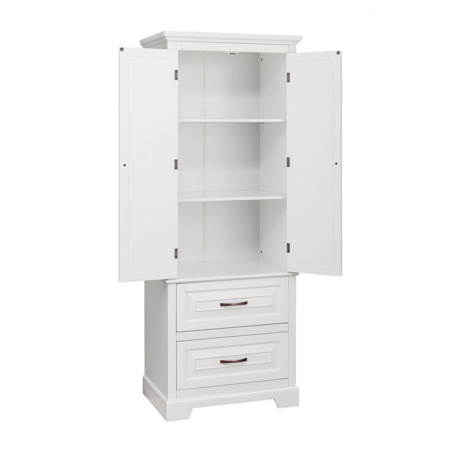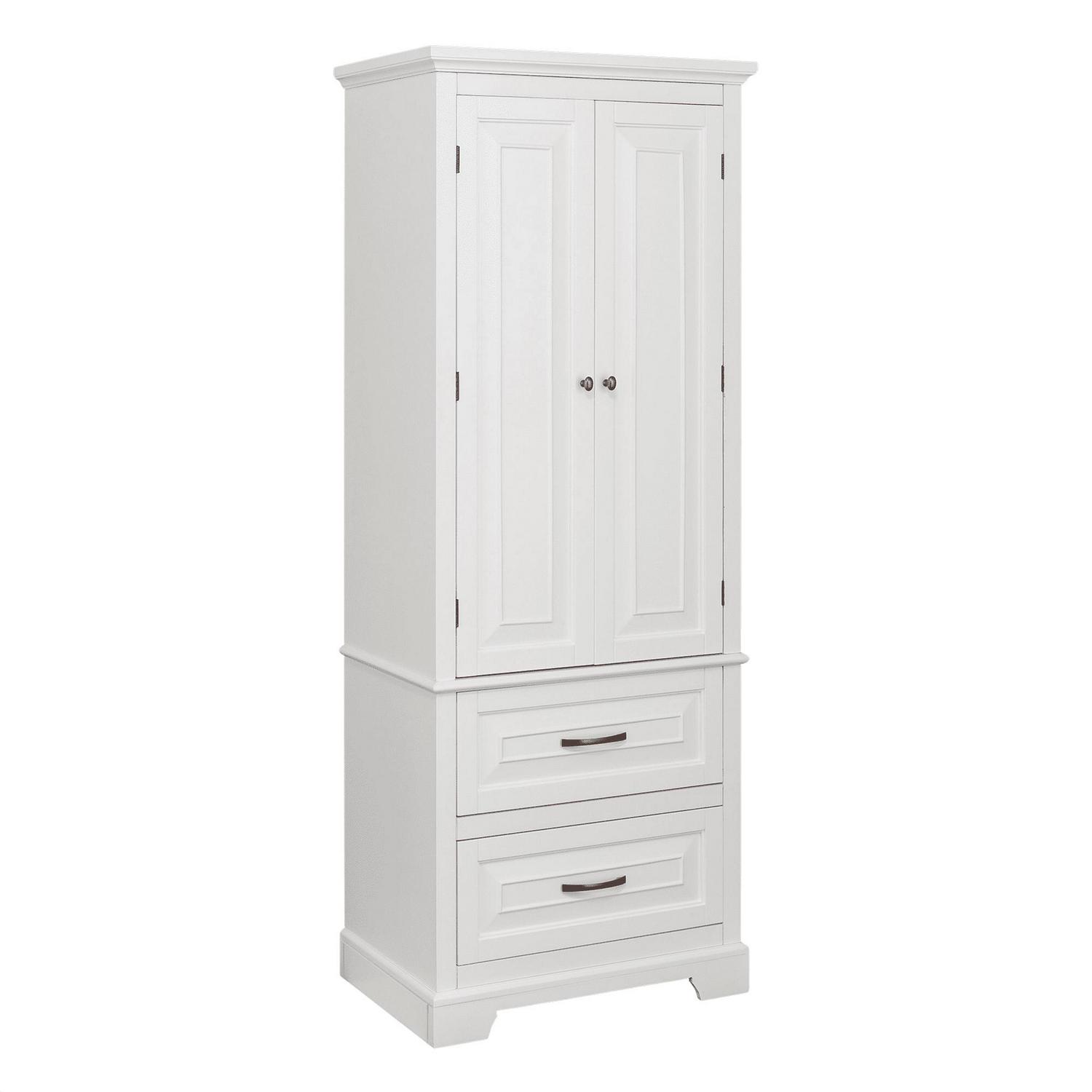 Upgrade your home storage while adding modern style with the Teamson Home St. James Wooden Linen Tower Cabinet with 2 Drawers. This decorative cabinet features a sleek white finish with a crown molded top and a minimalist silhouette for a beautiful addition to your space. The 3 included interior shelves and 2 bottom drawers make this cabinet a functional solution to your storage needs. Constructed from durable engineered wood, this storage unit is built to provide you with long-lasting organization. Easy, step-by-step instructions and all of the hardware needed for installation are included for quick assembly. Purchase this stylish linen cabinet alone or with other items from the St. James collection for a cohesive, updated look.