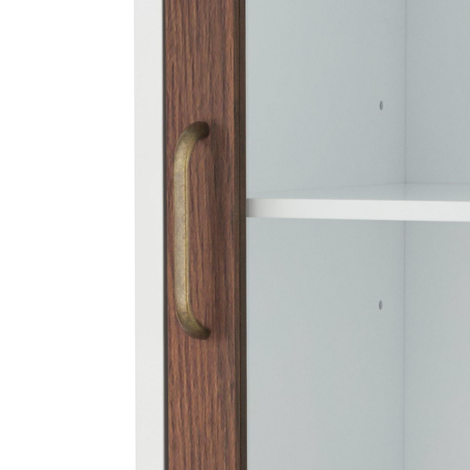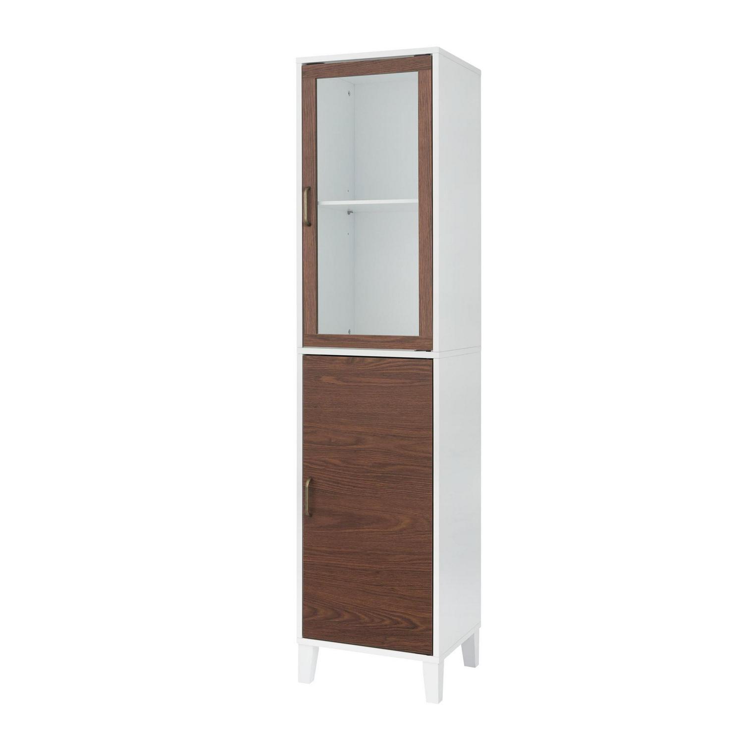 – STYLISH LINEN TOWER CABINET: Features a sleek white finish with one glass-panel door and one walnut brown finished door with brass pulls for an elevated and stylish addition to your space.
