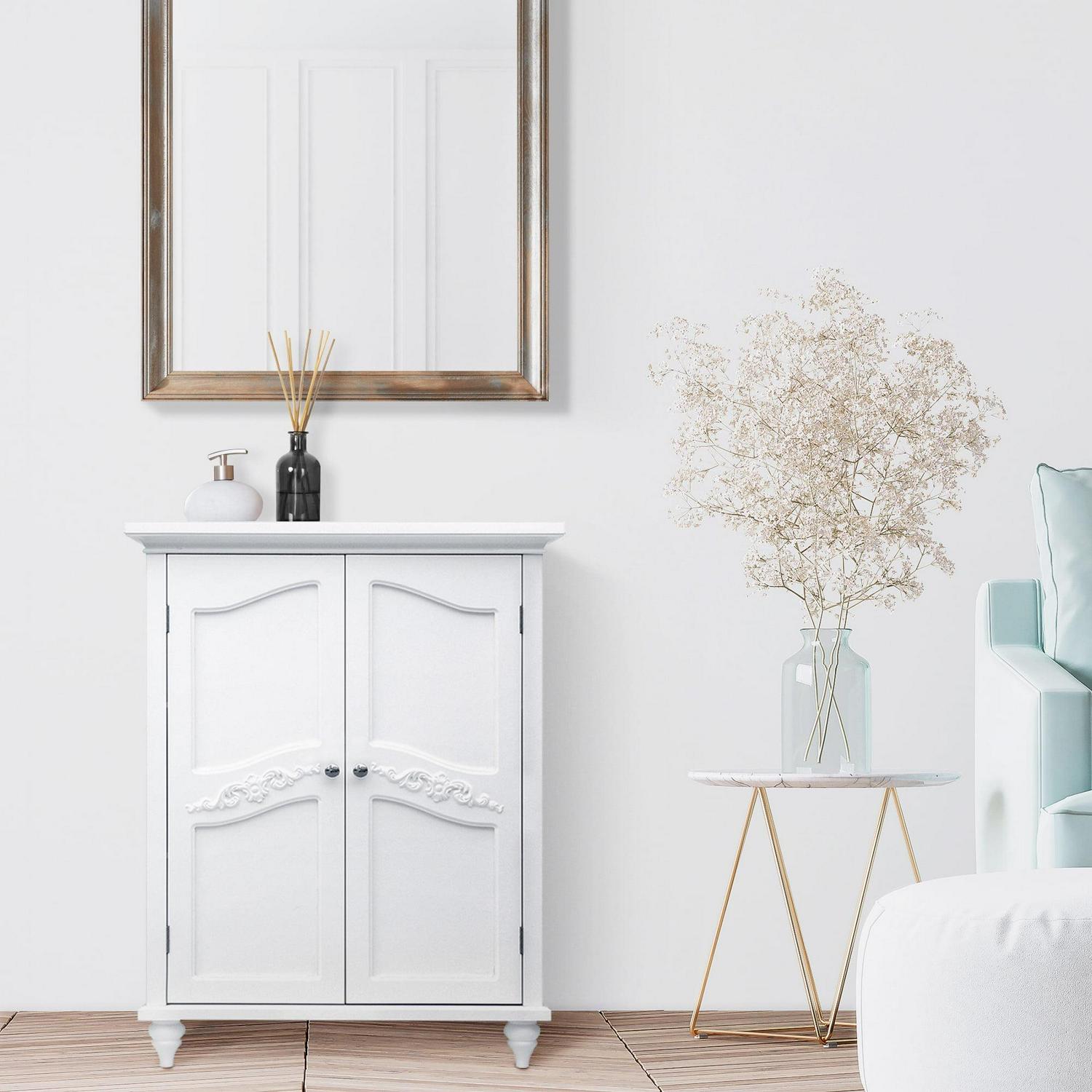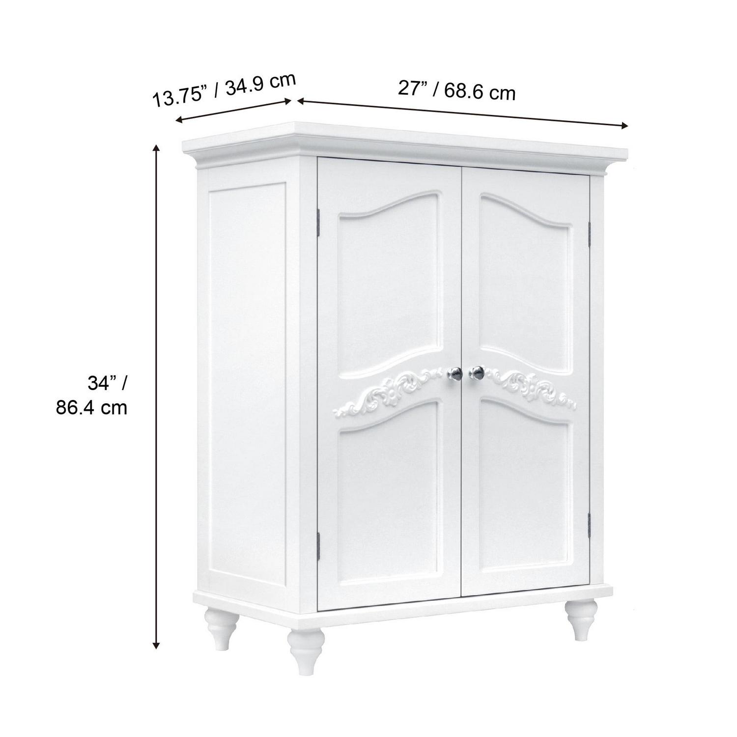 Upgrade your home storage while adding classic style with the Teamson Home Versailles Wooden Floor Cabinet with 2 Shelves. This decorative cabinet features a white finish with a crown molded top, metal knobs, and engraved doors for a timeless addition to your space. The 2 included adjustable shelves make this cabinet functional and customizable to suit your storage needs. Constructed from durable engineered wood, this storage unit is built to provide you with long-lasting organization. Easy, step-by-step instructions and all of the hardware needed for installation are included for quick assembly. Purchase this stylish floor cabinet alone or with other items from the Versailles collection for a cohesive, updated look. The Teamson Home Versailles Wooden Floor Cabinet with 2 Shelves measures 13.75″ x 27″ x 34″ to provide accessible storage without taking up too much space in your living area or bathroom.