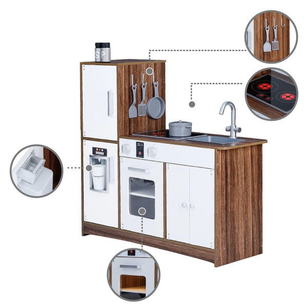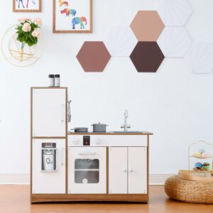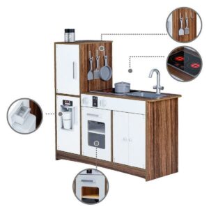 – INTERACTIVE FEATURES: Features openable doors, a refrigerator, 2 turning oven knobs, 2 induction burners with cooking noises, an ice maker, a sink, and a cabinet to enhance your little one’s play time