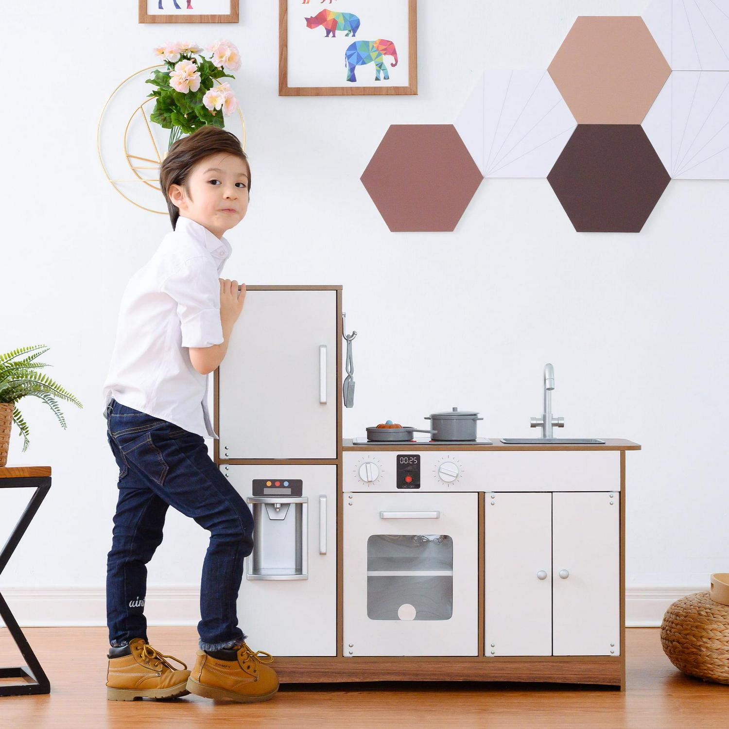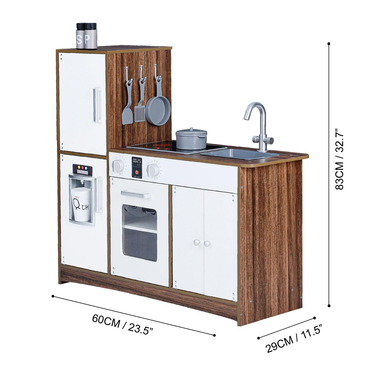 Give your little ones a kitchen of their own with the Teamson Kids Little Chef Palm Springs Classic Kids Play Kitchen with 6 Accessories. This retro-style play kitchen is designed with a natural wood finish and white accents, making it great for both boys and girls, and it completes any home, classroom, preschool, or daycare playroom. The functional and interactive design features openable oven doors, a refrigerator, 2 turning oven knobs, 2 induction burners that make realistic cooking noises and glow red, an ice maker, a sink, and an under-sink cabinet to enhance your little one’s play time. With 10 included accessories a pan, pot, 2 spatulas, 2 spice bottles, 3 plastic ice cube, and a cup included this toddler kitchen encourages role play and lights up your little chef s imagination and creativity. The durable and eco-friendly construction is kid-safe and easy to wipe clean with a damp cloth for every day messes. The easy-to-follow instructions allow for quick adult assembly so play time can start right away. This kid-sized toy kitchen has a compact size and is recommended for children ages 3 years and up. Induction cooker requires 2 1.5V AA/LR6 batteries (not included). For over 20 years, Teamson Kids has been manufacturing products of the highest quality along with the best craftsmanship. We take pride in our expertly crafted high quality children’s wooden furniture designs and strive to exceed all safety standards. We create beautiful pieces that encourage your child’s imagination while seamlessly fitting into your home.