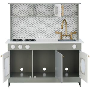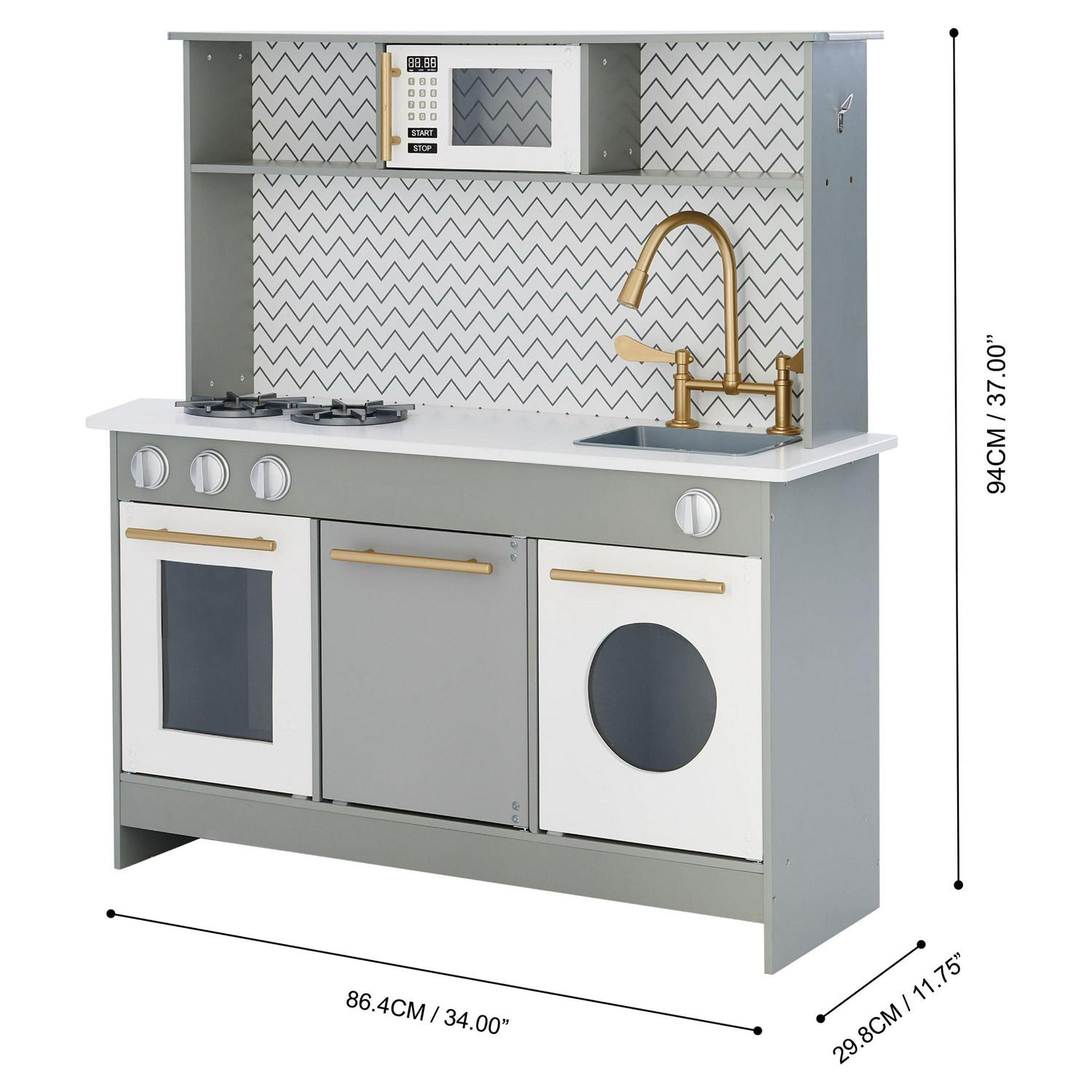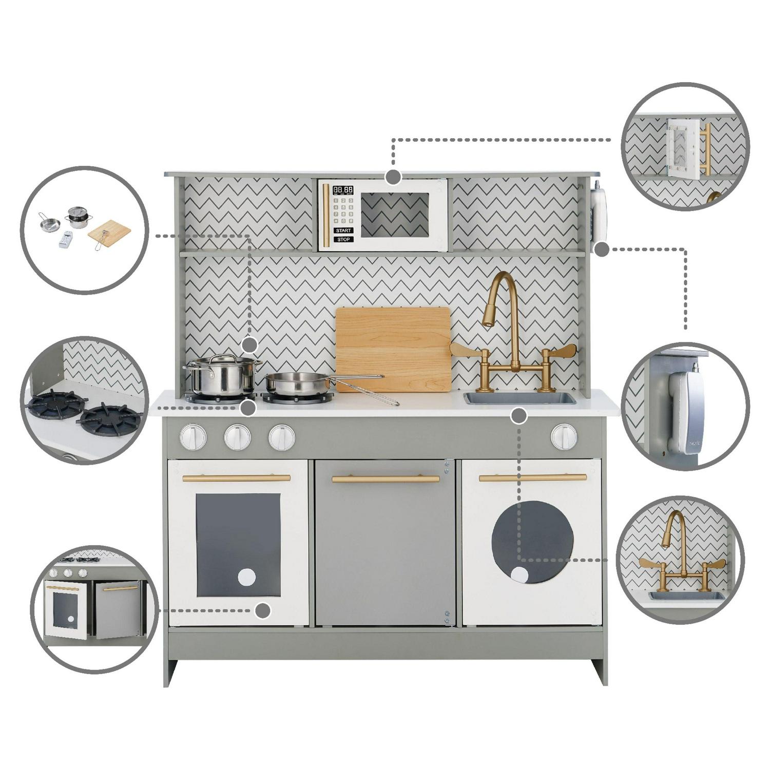 – Chic & modern: Designed to be just as stylish, if not more so, than grown-up kitchens, the Little Chef Berlin Modern Play Kitchen is absolutely stunning. With a white and gray chevron backsplash and gold hardware , Berlin will have all the adults basing their kitchen remodel on it!