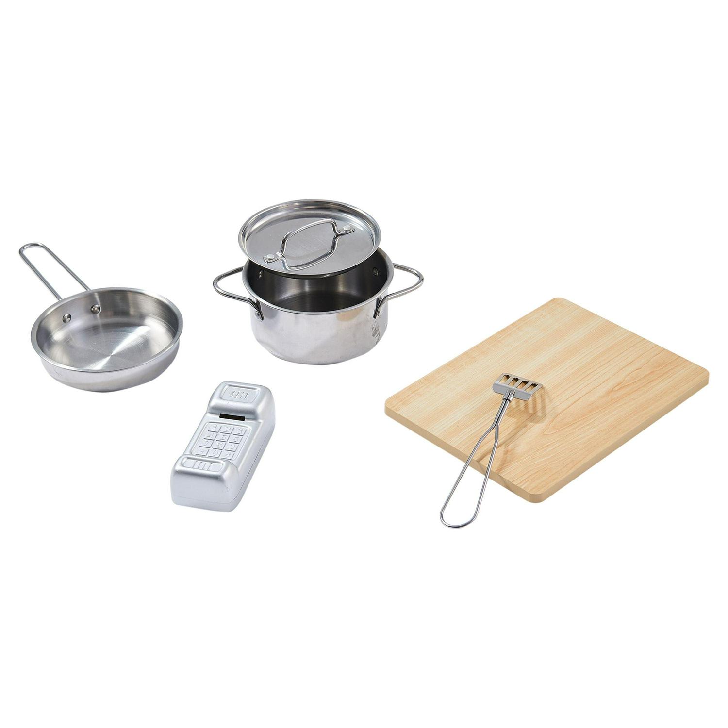 – Includes: Little Chef Berlin includes 6 accessories: a stainless steel pan, stainless steel pot, stainless steel lid, stainless steel spatula, a cutting board, and a play phone.