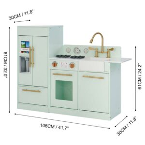 Give your little ones a kitchen of their own with the Teamson Kids Little Chef Charlotte Modern Kids Kitchen Playset. This contemporary play kitchen is designed with an elegant mint look and gold accents, making it great for both boys and girls, and it completes any home, classroom, preschool, or daycare playroom. The functional and interactive design features openable oven and refrigerator doors, 4 turning oven knobs, 2 oven burners, a freezer, a sink, and an under-sink cabinet to enhance your little one’s play time. With realistic details including a cup with ice cubes, a clock, and dials, this toddler kitchen encourages role play and lights up your little chef s imagination and creativity. The durable and eco-friendly MDF construction is kid-safe and easy to wipe clean with a damp cloth for every day messes. The easy-to-follow instructions allow for quick adult assembly so play time can start right away. This kid-sized toy kitchen measures 41.75″ x 12″ x 32″ and is recommended for children ages 3 years and up.