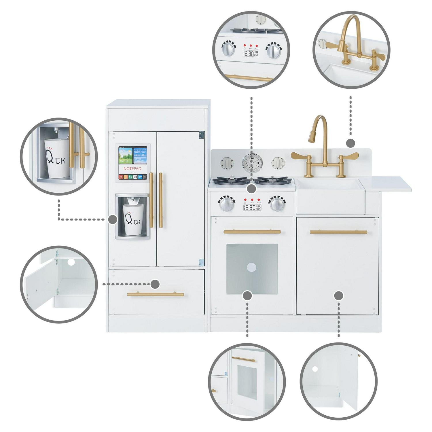 Give your little one their own cooking space with the Teamson Kids Little Chef Charlotte Modern Kids Kitchen Playset. This contemporary play kitchen is designed with a classic white look and gold hardware, making it great for both boys and girls, and completes any home, classroom, , or playroom. The functional and interactive design features a refrigerator with freezer plus kitchenette that each stand on their own. The kitchenette includes an oven, 2 turning oven knobs, 2 turning stove dials, 2 stove burners, farmhouse style sink, clock, extended countertop, and cabinet to enhance your little one’s play time. The refrigerator features an ice maker and includes a cup with ice cubes. With realistic details this toddler kitchen encourages role play and lights up your little chef s imagination and creativity. The durable and eco-friendly MDF construction is kid-safe and easy to wipe clean with a damp cloth for every day messes. The easy-to-follow instructions allow for quick adult assembly so play time can start right away. This kid-sized toy kitchen measures 41.75″ x 12″ x 32″ and is recommended for children ages 3 years and up.
