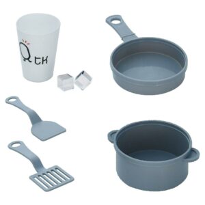 – INCLUDED: This complete set includes a kitchenette with microwave, stove, oven and sink, plus a cupboard with an extended countertop, minifridge with ice machine, shelving space and a chalkboard. 7 kitchen essentials include a pot, pan, spatula, slotted spatula, cup and two ice cubes for interactive play.
