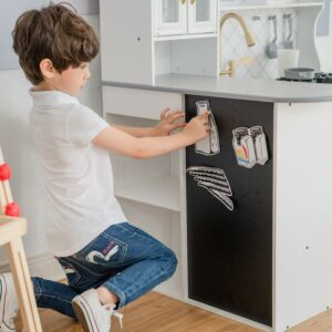 – INTERACTIVE: The cupboard features a chalkboard so your little one can write up today’s menu or grocery list! The sink has turning faucet handles and the refrigerator features an ice dispenser for never ending play!