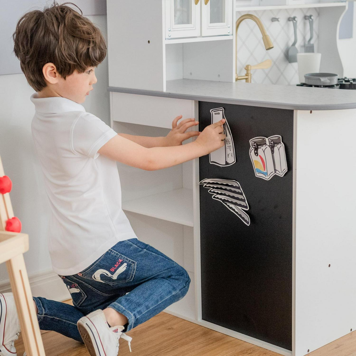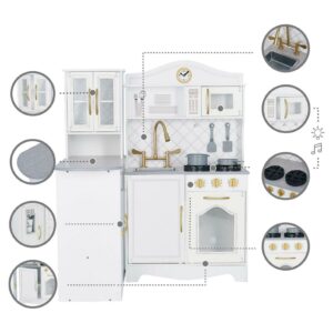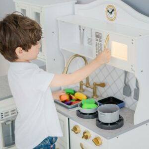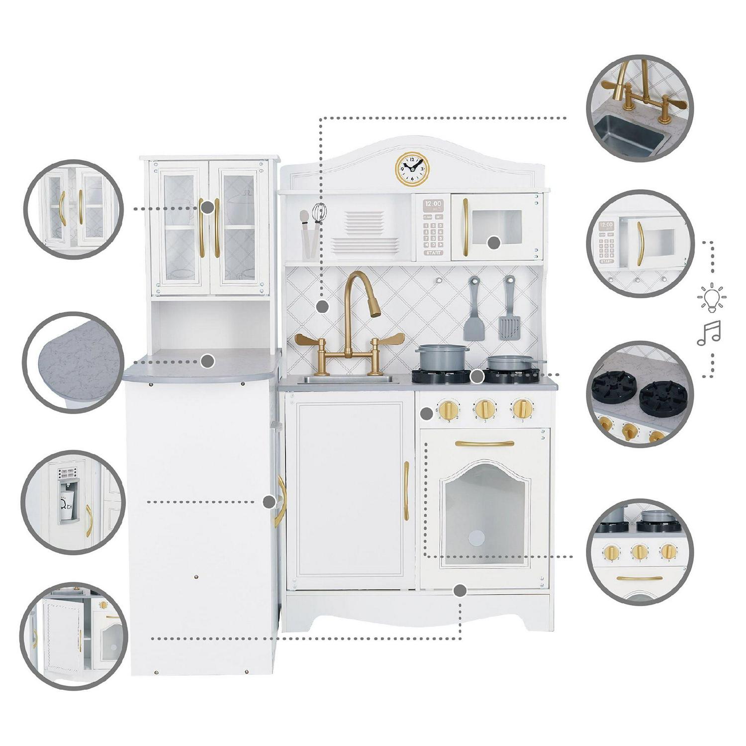 Wash, cook, bake and serve with the Teamson Kids Little Chef Upper East Retro Kitchen. This L-shaped play kitchen features a classic white look with gold accents and has everything your little one needs to make imaginary gourmet meals! Two freestanding appliances include a kitchenette and cupboard. The kitchenette includes a stink, oven, cabinet, stove, and microwave with realistic lights and sound effects. The cupboard features a miniature refrigerator, extended countertop, shelves and cabinet. The kitchen’s interactive design includes openable doors, turning knobs and handles, ice dispenser, chalkboard, and analog clock with movable hands. 7 accessories include a pot, pan, spatula, slotted spatula, cup and two ice cubes. The sturdy and eco-friendly MDF construction is kid-safe and easy to wipe clean. The included step-by-step instructions allow for quick adult assembly for convenient setup. This kid-sized pretend play kitchen measures 34.5″ long, 28.5″ deep, and 42″ tall when placed side by side, and is recommended for kids ages 3 years and up.