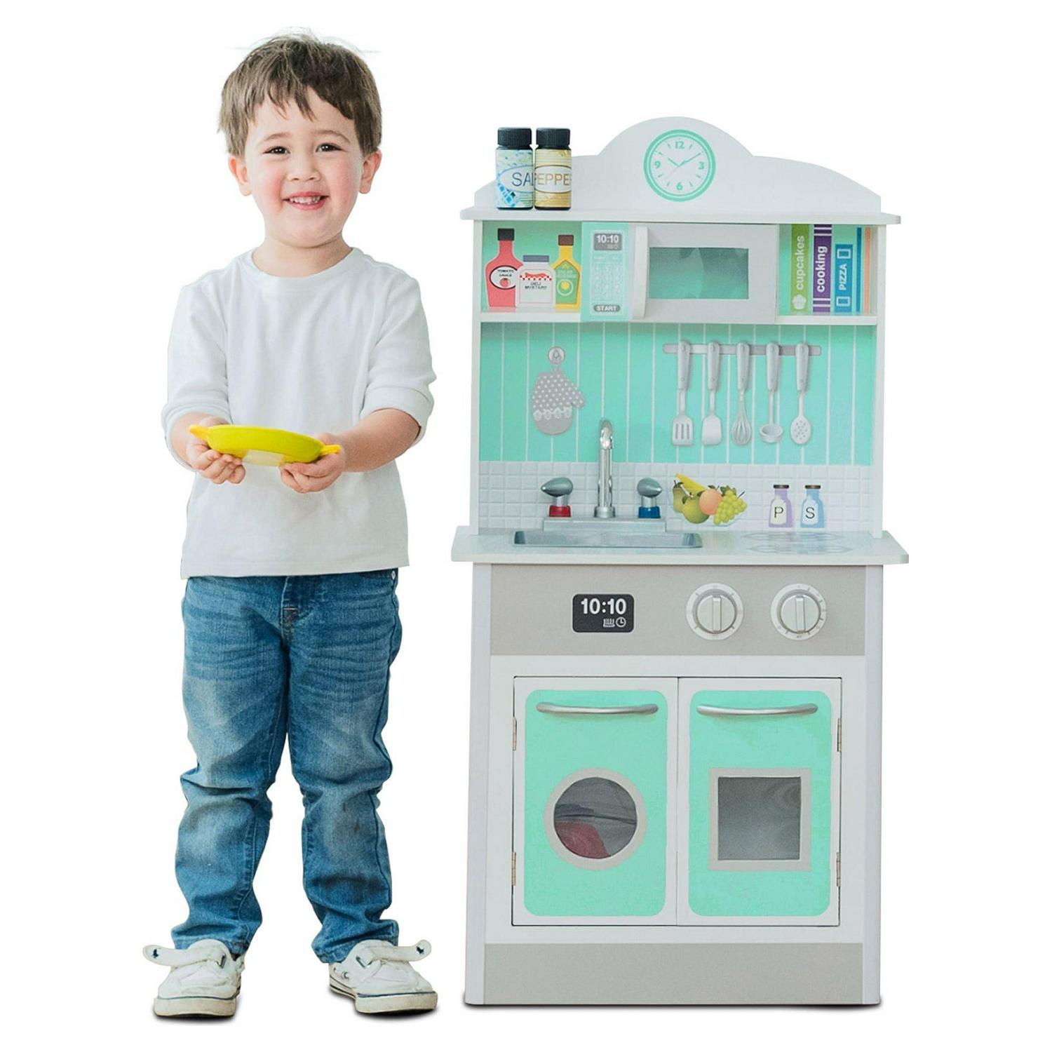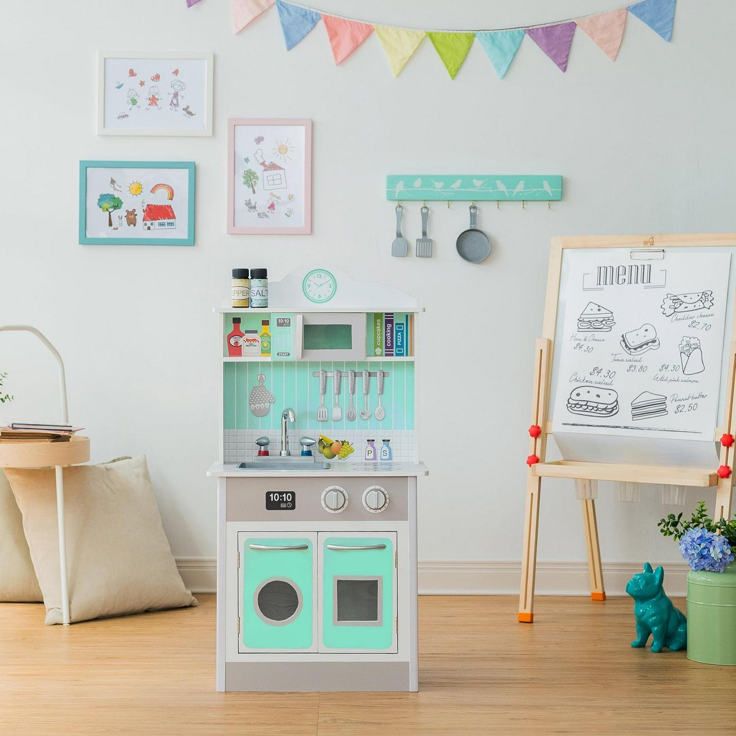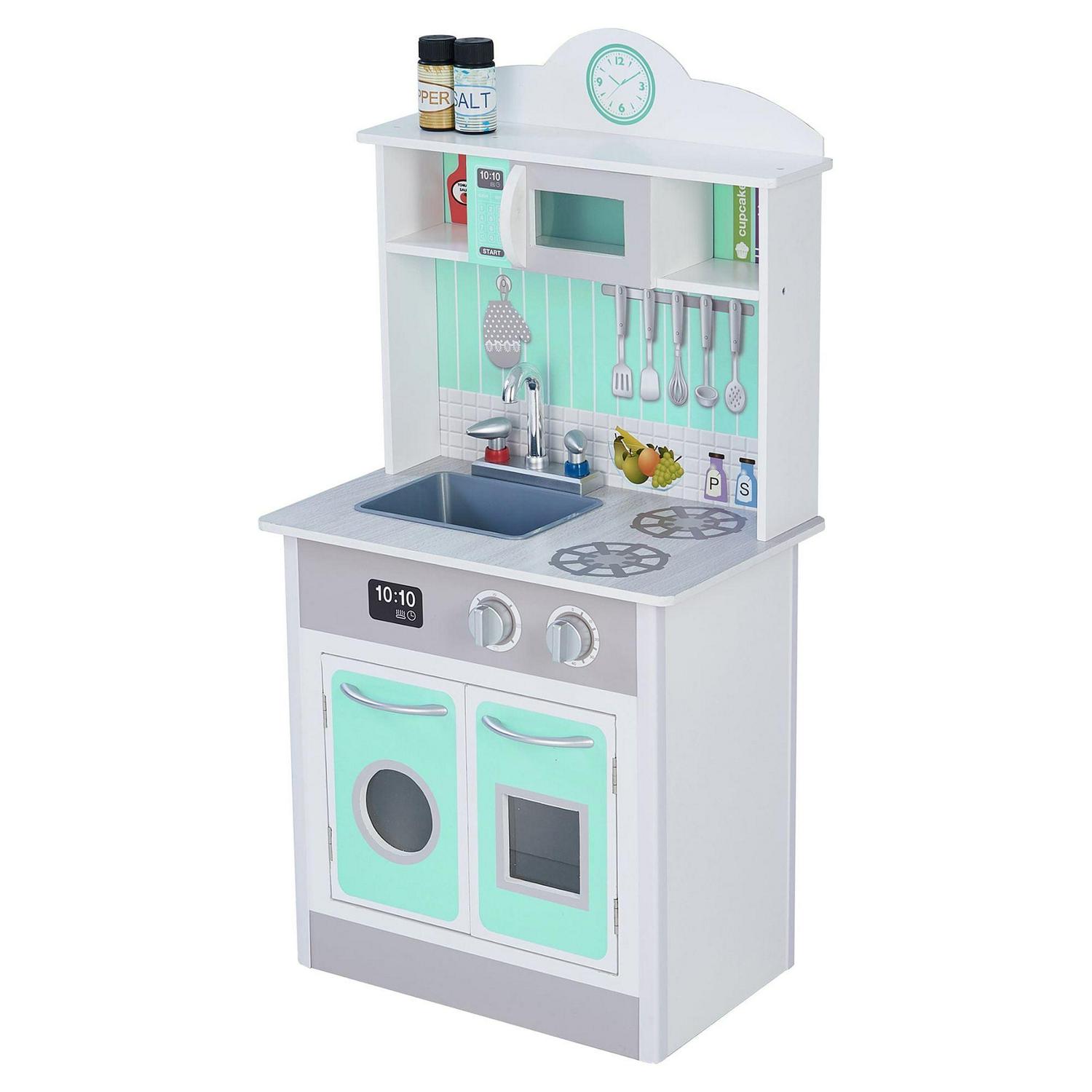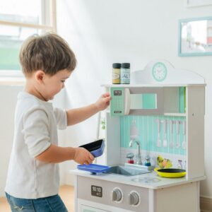 Teamson Kids Little Chef Madrid Classic Wooden Play Kitchen features a classic white finish with mint and gray accents and chrome-like hardware. Compact and interactive, this play set features turning oven knobs that make a clicking noise, and detailed illustrations on the backsplash to help spark imagination. Multiple storage compartments keep play food and cookware organized. Includes a set of pretend salt and pepper seasoning bottles. All Teamson Kids products are certified safety tested, are lead- and phthalates-free using non-toxic paint, are CPSIA compliant, and meet ASTM F963 standards. Since 1997, Teamson Kids has given flight to fun, discovery, and learning through beautifully crafted, safe, and trendy furniture pieces and toys for kids with a spirit of curiosity and adventure.