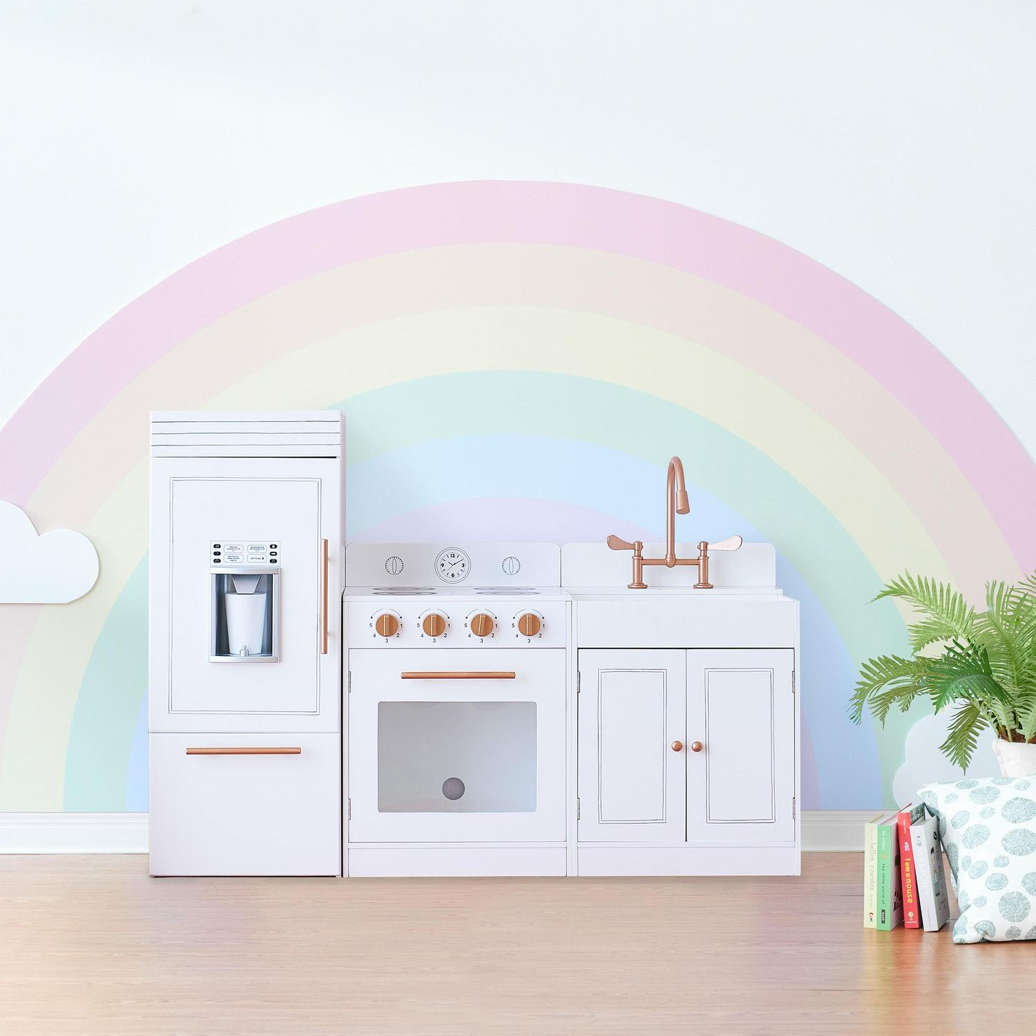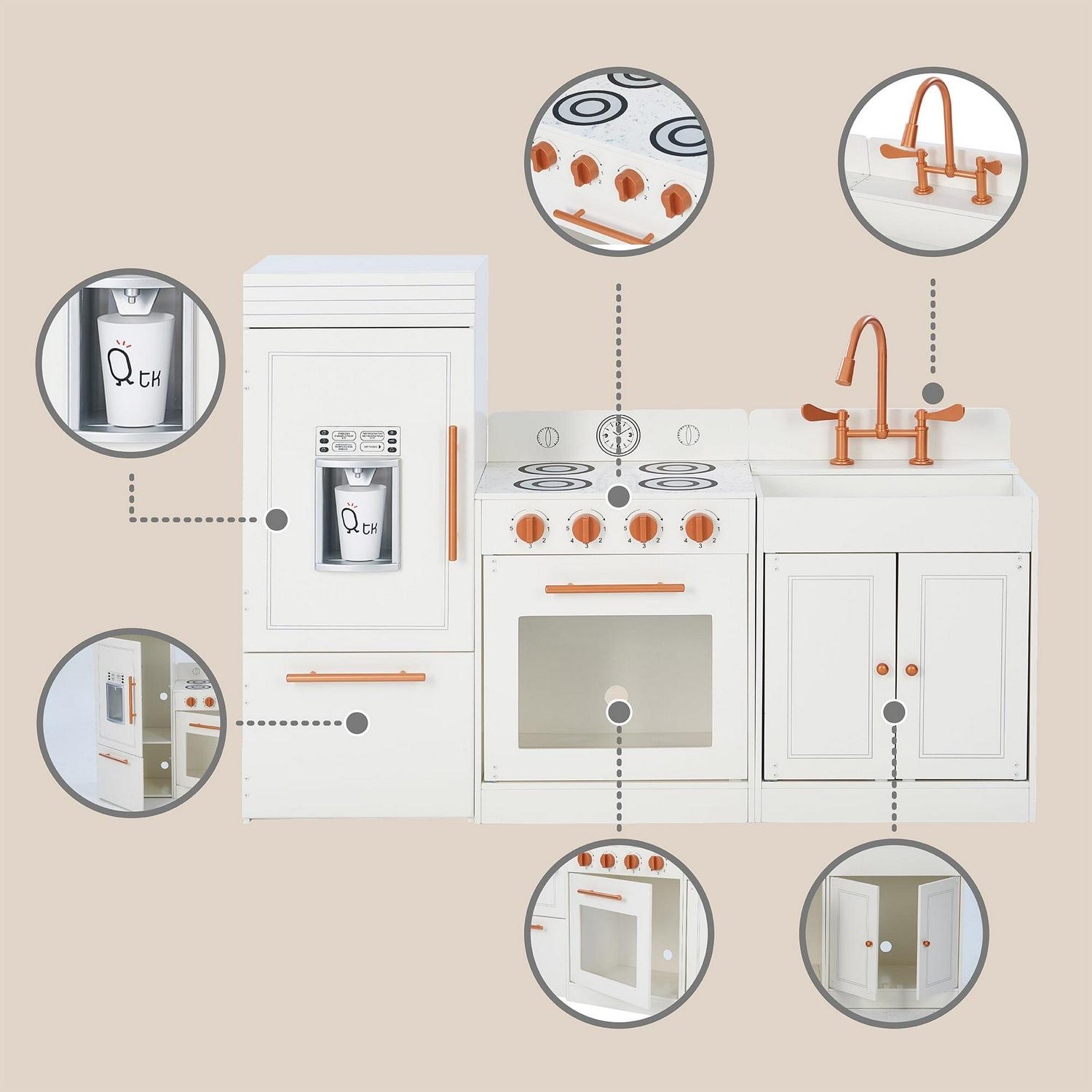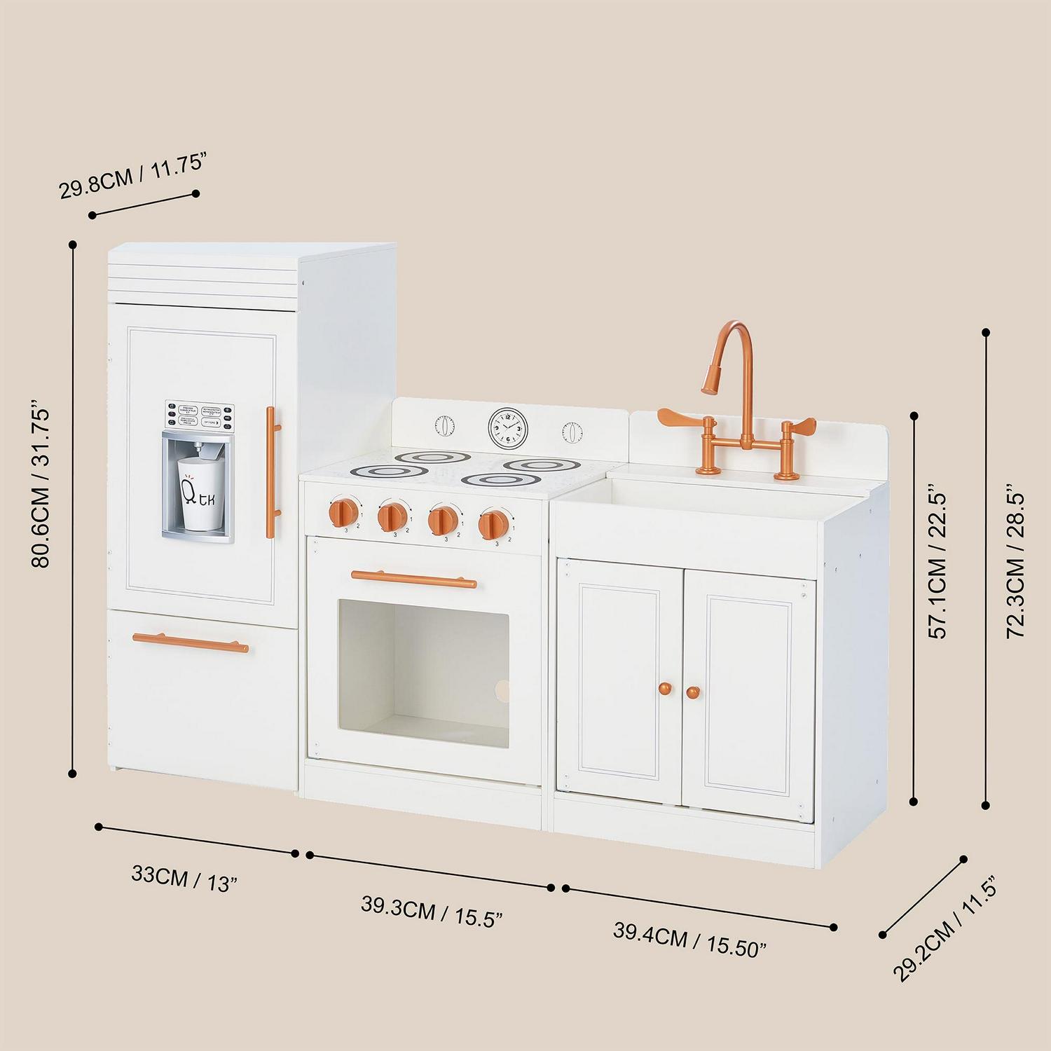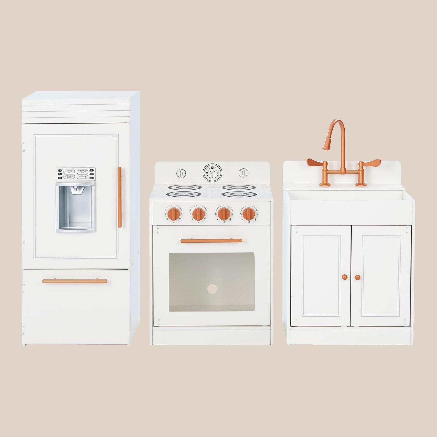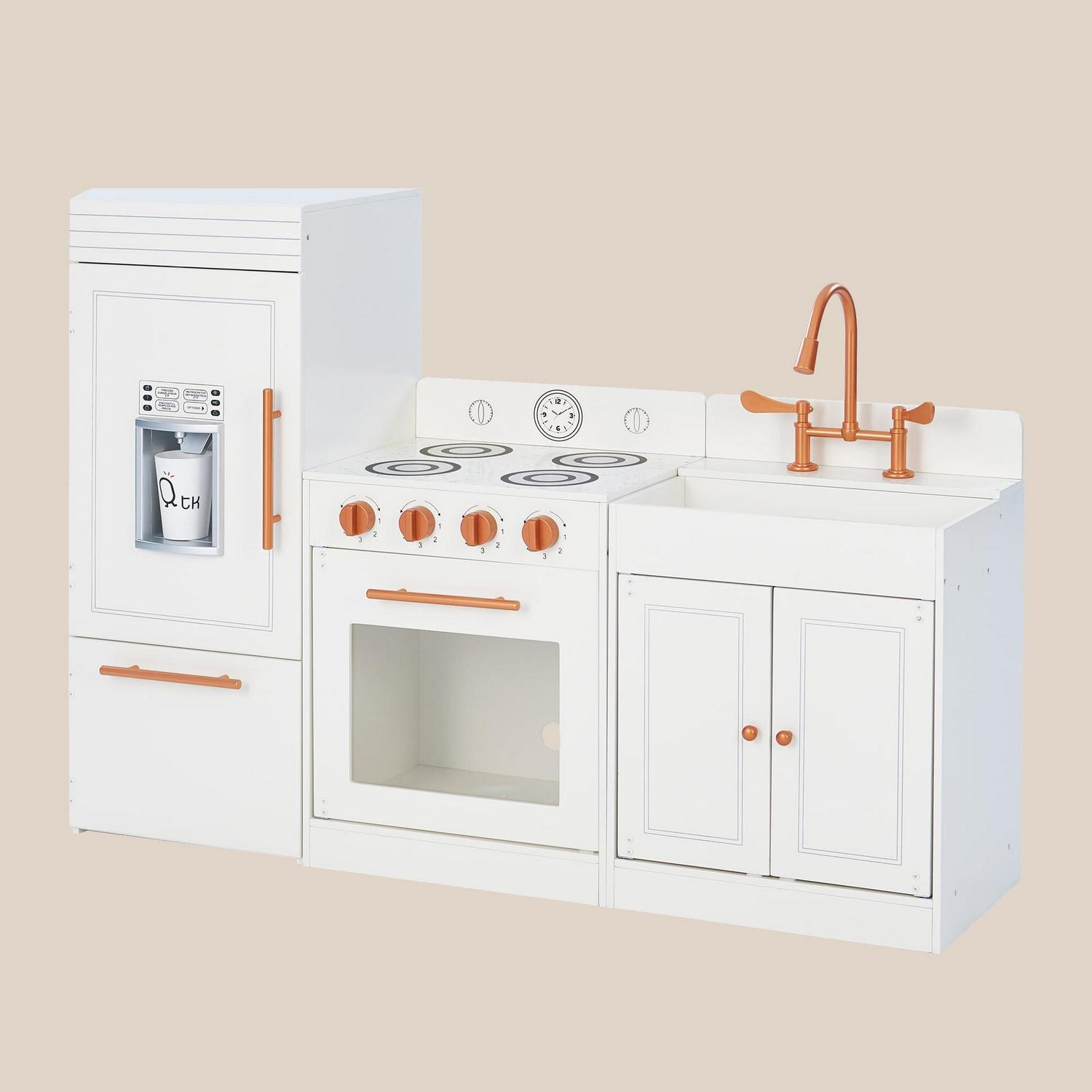 Give your little one their own cooking space with the Teamson Kids Little Chef Paris Classic Kids Kitchen Playset. This adorably glam play kitchen is designed with a classic white finish and rose gold hardware, making it just as stylish as a grown-up kitchen and perfect for both boys and girls! The fun and interactive design features three free-standing stations: refrigerator, oven range, and sink, each with realistic details that stimulate creative play. The refrigerator includes a freezer and built-in icemaker, while the oven range features turning knobs and the sink flaunts turning faucet handles and underneath storage cupboard, all sure to light up your little chef s imagination!