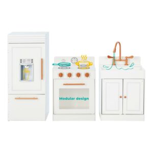 Give your little one their own cooking space with the Teamson Kids Little Chef Paris Classic Kids Kitchen Playset. This adorably glam play kitchen is designed with a classic white finish and rose gold hardware, making it just as stylish as a grown-up kitchen and perfect for both boys and girls! The fun and interactive design features three free-standing stations: refrigerator, oven range, and sink, each with realistic details that stimulate creative play. The refrigerator includes a freezer and built-in icemaker, while the oven range features turning knobs and the sink flaunts turning faucet handles and underneath storage cupboard, all sure to light up your little chef s imagination! Teamson is a global lifestyle home designs brand bringing joy into every home through beautiful, quality pieces made for stylishly comfortable everyday living. Our Teamson Kids brands give flight to fun, discovery and learning through beautifully crafted, safe, and trend-right furniture pieces and toys for kids with a spirit of curiosity and adventure.