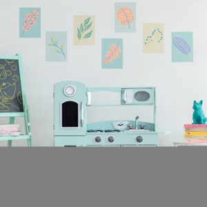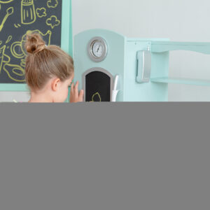 Give your little ones a kitchen of their own with the Teamson Kids Little Chef Westchester Classic Kids Kitchen Playset. This retro-style play kitchen is designed with a classic mint green look and metallic accents, making it great for both boys and girls, and it completes any home, classroom, preschool, or daycare playroom. The functional and interactive design features openable oven, refrigerator, and microwave doors, a chalkboard and drink dispenser built into the refrigerator, 3 turning oven knobs, 2 oven burners, a storage cupboard, a sink, and an under-sink cabinet to enhance your little one’s play time. With the included toy cordless phone, this toddler kitchen encourages role play and lights up your little chef s imagination and creativity. The durable and eco-friendly MDF construction is kid-safe and easy to wipe clean with a damp cloth for every day messes. The easy-to-follow instructions allow for quick adult assembly so play time can start right away. This kid-sized toy kitchen measures 38.25″ x 11.5″ x 36.75 and is recommended for children ages 3 years and up.