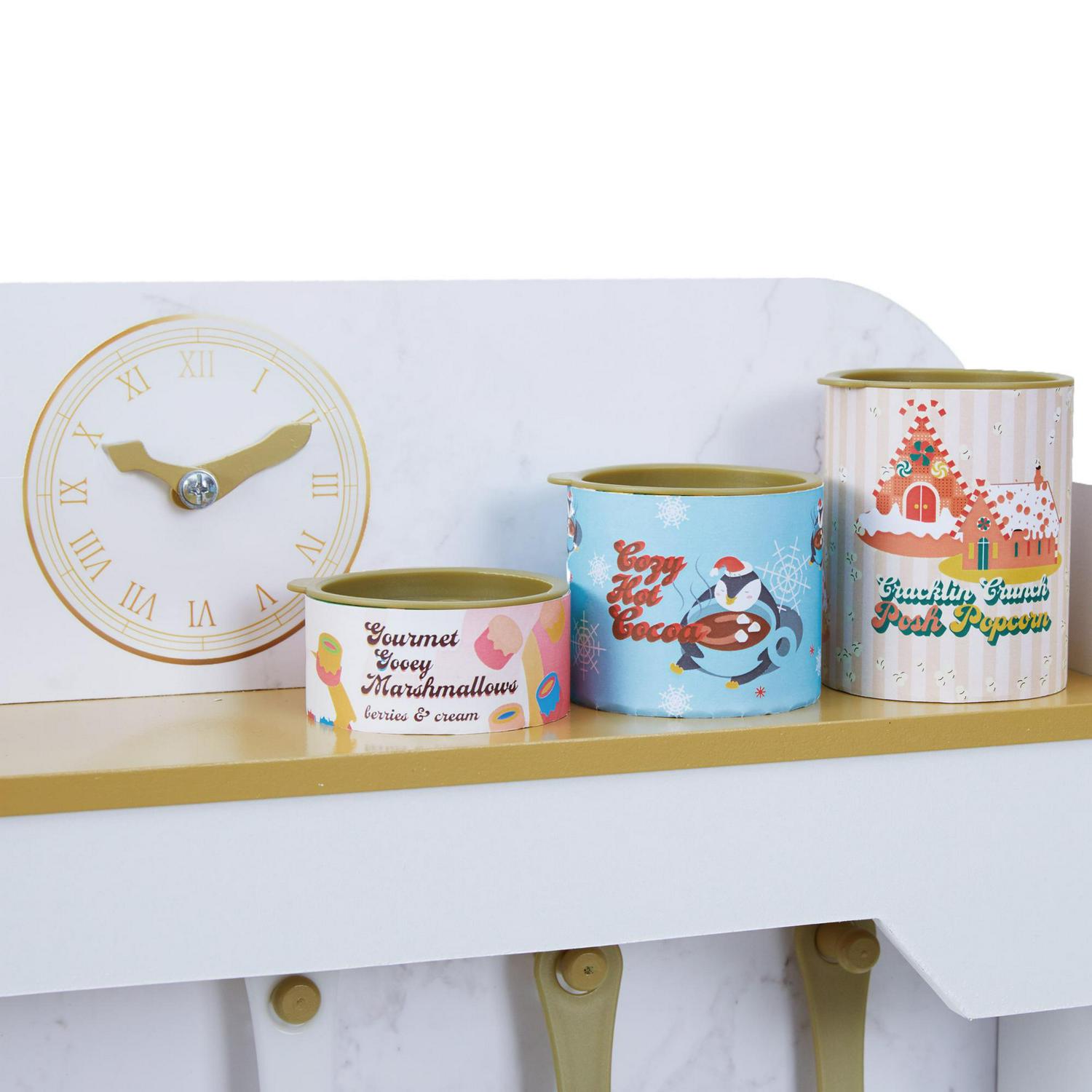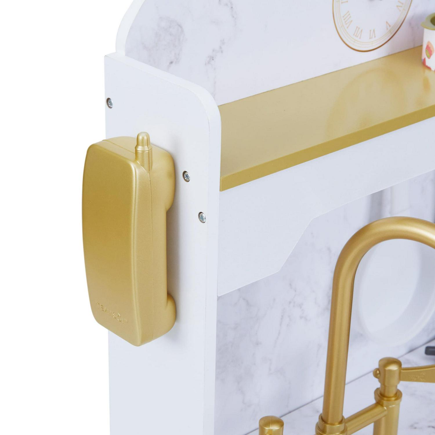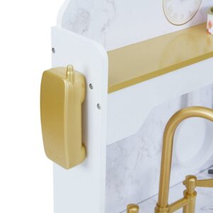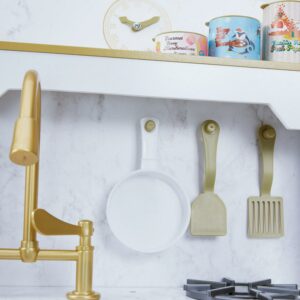 Teamson Kids’ Petite Versailles Play Kitchen gives your little chef a realistic cooking experience. The white finish, gold hardware and gray marble backsplash add a sophisticated style to this classic kitchen set. Interactive details include turning and clicking knobs, analog clock with movable hands and turning faucet levers. The deep farmhouse style sink with gold gooseneck faucet and turning levers provides a space to wash vegetables or clean the dishes. The hooks on the marble backsplash, top shelf and underneath cabinet all provide storage space for cookware and pretend food. Eleven accessories include a phone, pots and pans, spatulas, seasoning and pretend cans of food. The Petite Versailles Classic Play Kitchen measures 19.75″ long, 18.25″ deep, and 35.5″ tall and is recommended for ages 3 years and up.