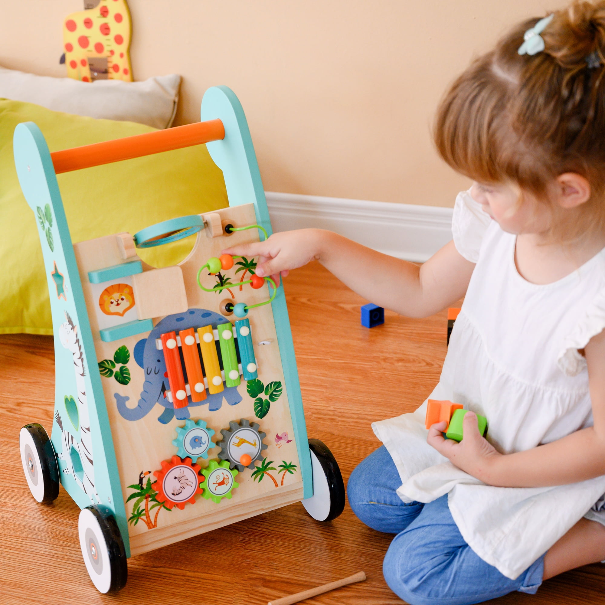 The perfect companion to your little one’s first steps, the Preschool Play Lab Safari Animal Baby Walker provides support and stability for your little one as they learn to walk, as well as help your baby learn and grow through screen-free tactile play. This adorable baby walker is equipped with built-in toys like a xylophone, mini bead maze, spinning gears, and shape sliders and sorters, keeping kids engaged and entertained as they develop their fine motor skills, hand-eye coordination, and problem-solving abilities. The sturdy frame ensures kids can safely navigate their environment while exploring their newfound mobility, and an opening in the back is perfect for stowing away loose toys.