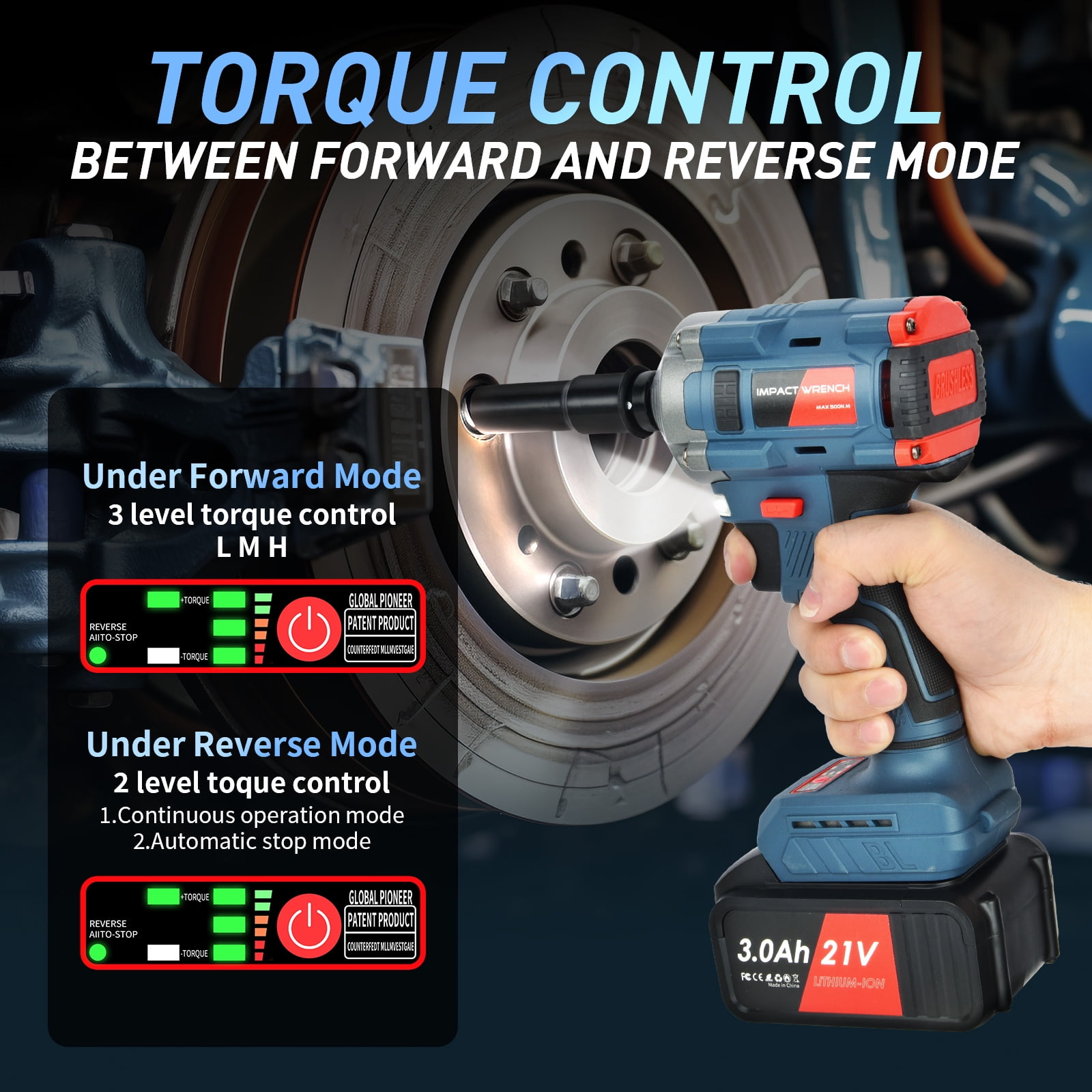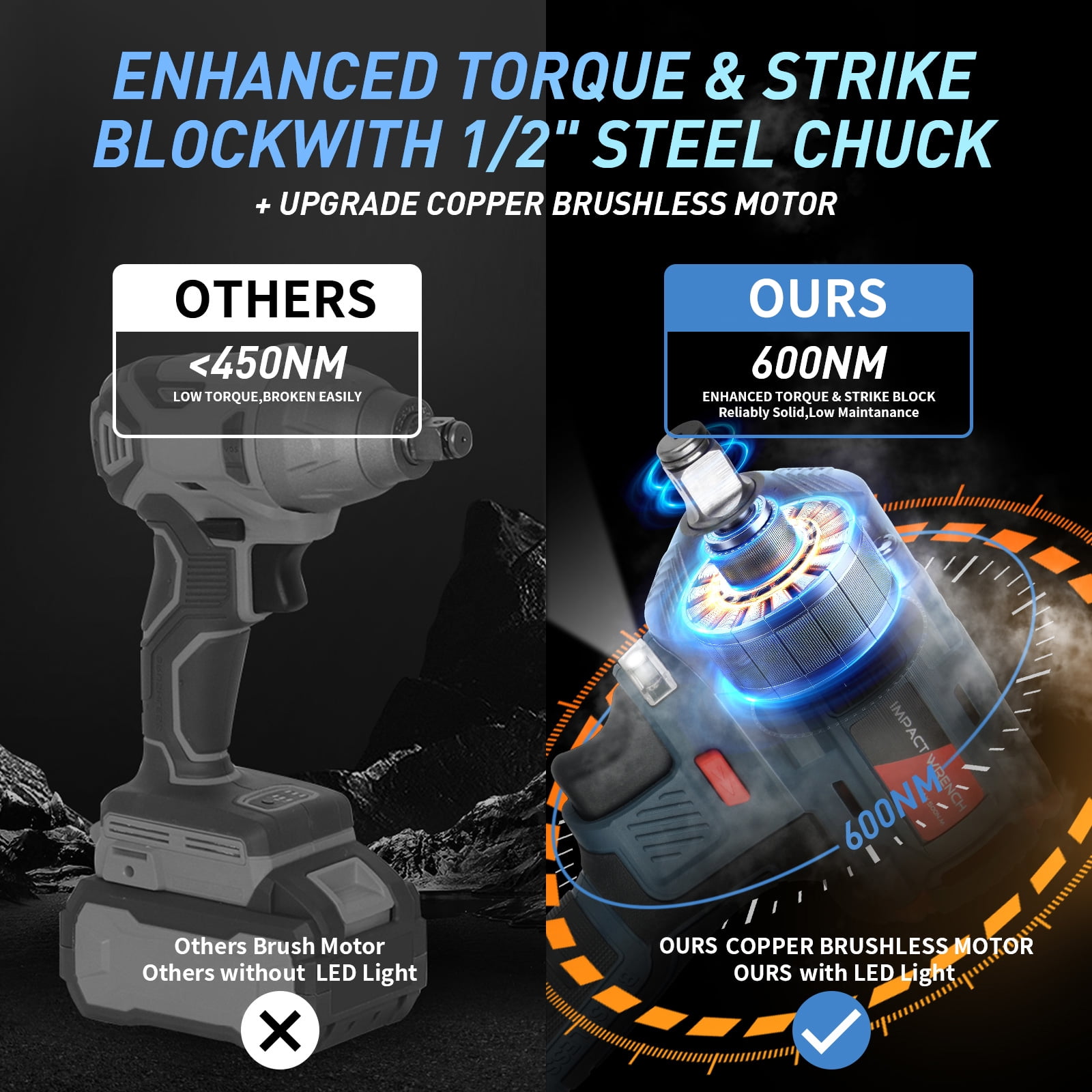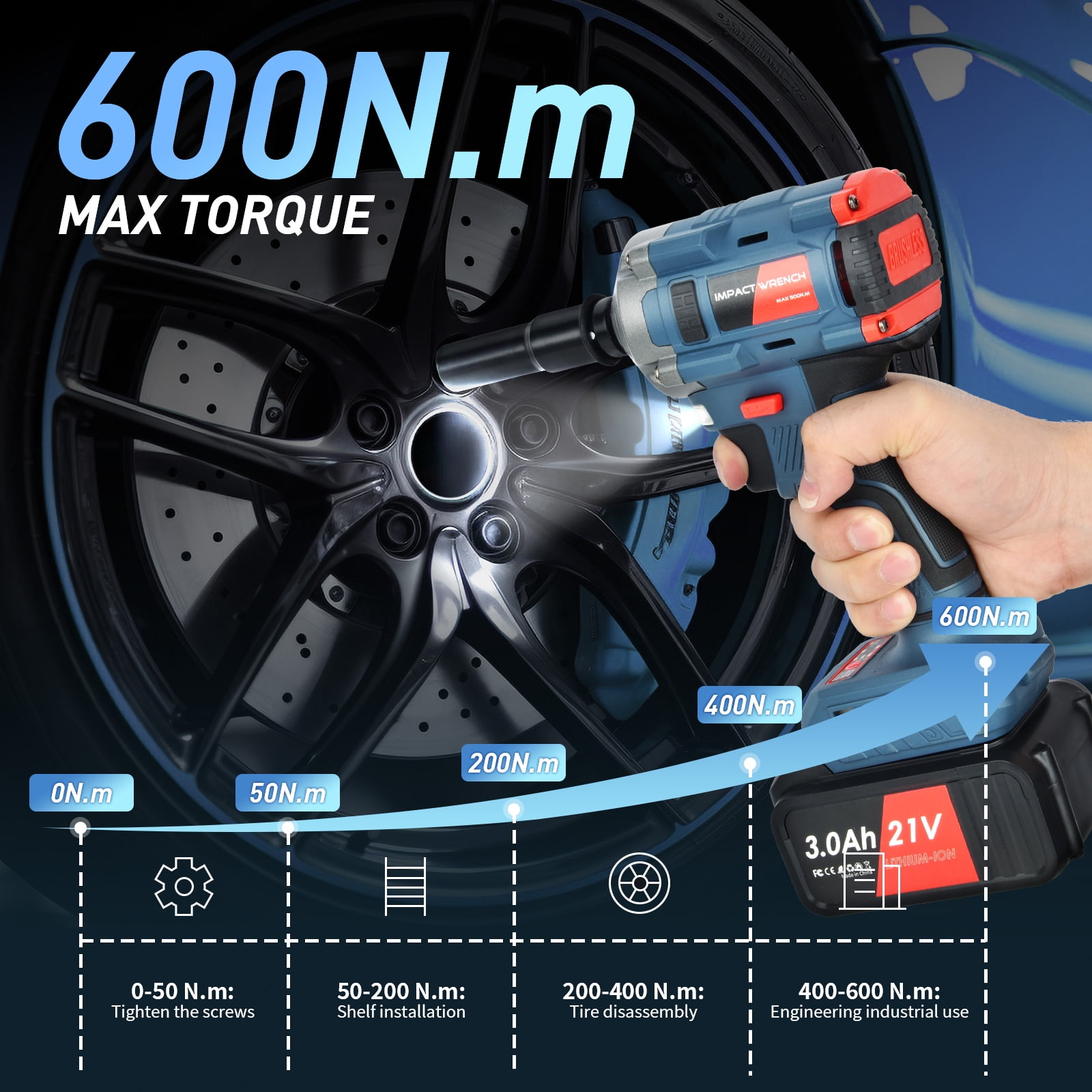 Long Battery Life: 10-cell battery pack, 3000mAh large capacity, strong battery life. High Torque: The high-power brushless motor provides surging power, stable operation, and more efficient nut disassembly and assembly. Adjustable Speed: The speed of the tool can be increased by increasing the pressure of the switch trigger to meet the needs of different working conditions. LED Lghting: The LED light design under the working end can provide sight lighting in dark environments to ensure normal work in the dark. Cable-free Design: not bound by wires, flexible and convenient to use in hand, light and portable, and stress-free for long-term use.