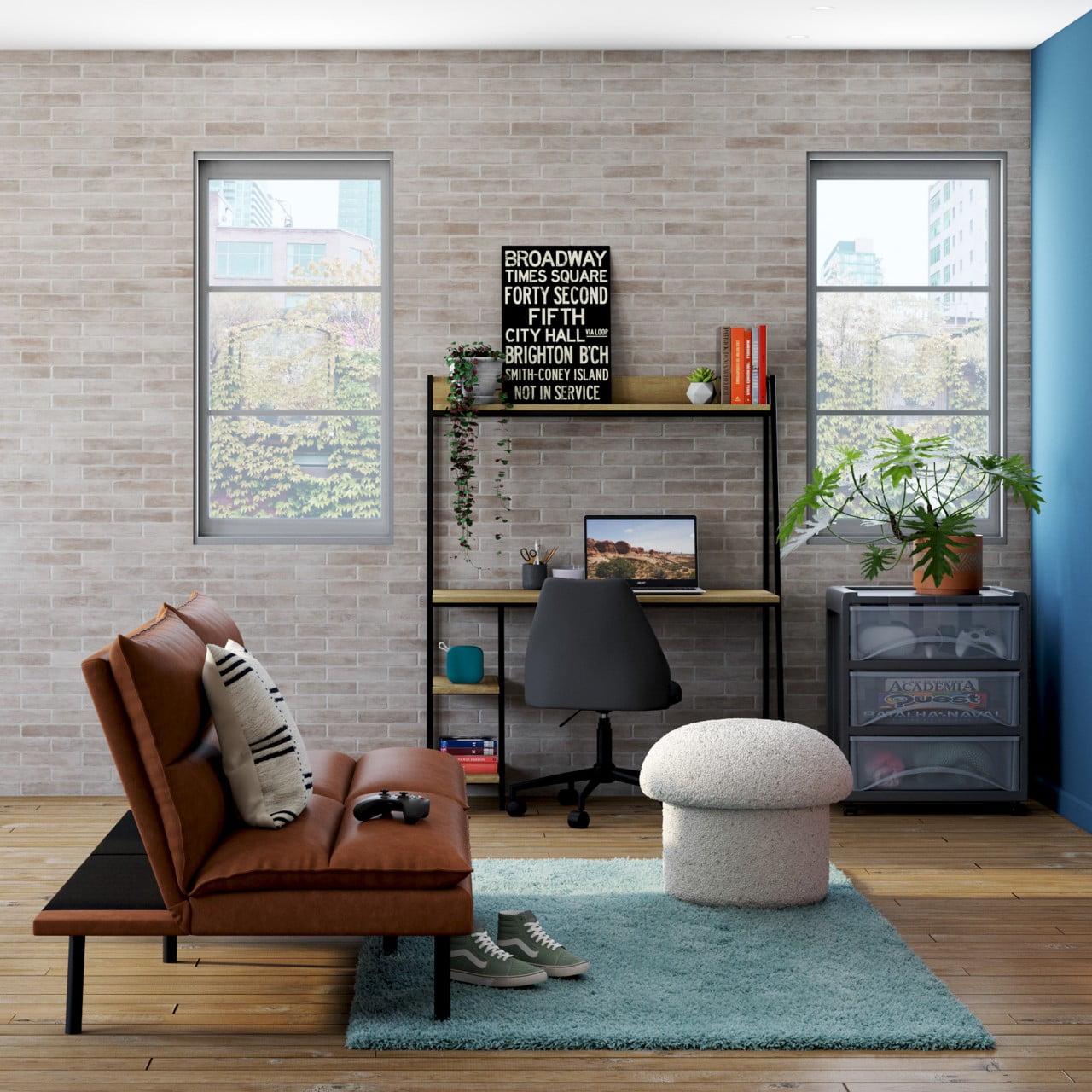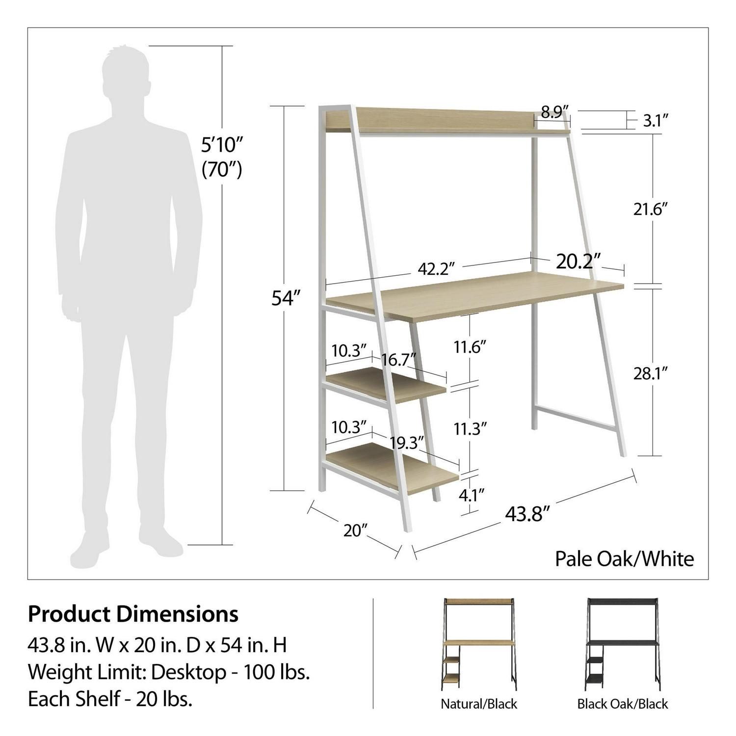 Form meets functionality with the handsome and multifunctional Beck Ladder Desk by The Teen Novogratz. Perfect for a Teen’s room, the Ladder Desk features a compact workspace, gallery top, and open back ideal for adding a corkboard or mirror on the open wall space behind the desktop. Keep notebooks and office supplies close at hand on the two built-in shelves below and adorn the gallery top with artwork, décor or books. The Beck Ladder Desk is made from engineered wood and powder-coated metal and available in multiple finishes to suit your Teen’s individual style. Assembly required. Two adults recommended to assemble. Assembled measurements: 43.8 W x 20 D x 54 H. Assembled weight: 44.79 lbs.