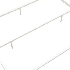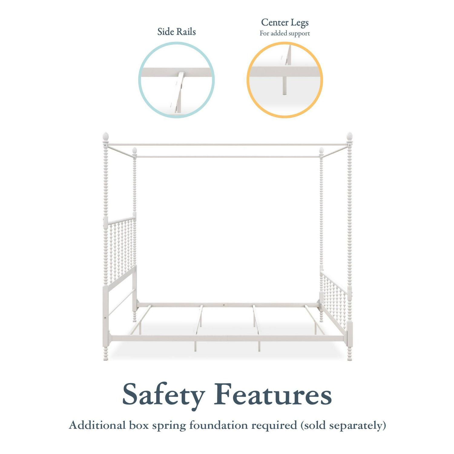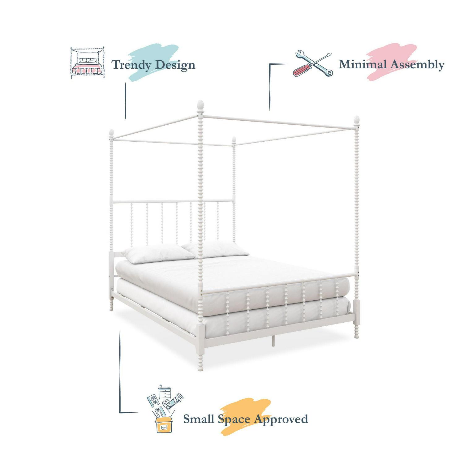 Do you love Parisian-style furniture The DHP Jenny Lind Metal Canopy Bed has a timeless design that will become the centerpiece of your bedroom. With scrollwork details on the four bedposts, the headboard and the footboard, the Jenny Lind has a very delicate aesthetic that allows you to show your personality in your décor. The headboard and footboard feature vertical rails that add more dimension and intricacy to the bed’s design. The all-metal construction includes metal side rails and additional metal center legs to provide stability and durability to your bed for years to come. An additional box spring or foundation is required to support the mattress (sold separately). This bed frame makes the perfect addition to your teen’s bedroom, your guest bedroom, or even your master bedroom. Available in Twin, Full, Queen and King size, the DHP Jenny Lind Metal Canopy Bed is offered in white and black to make sure you find the perfect option for your bedroom!