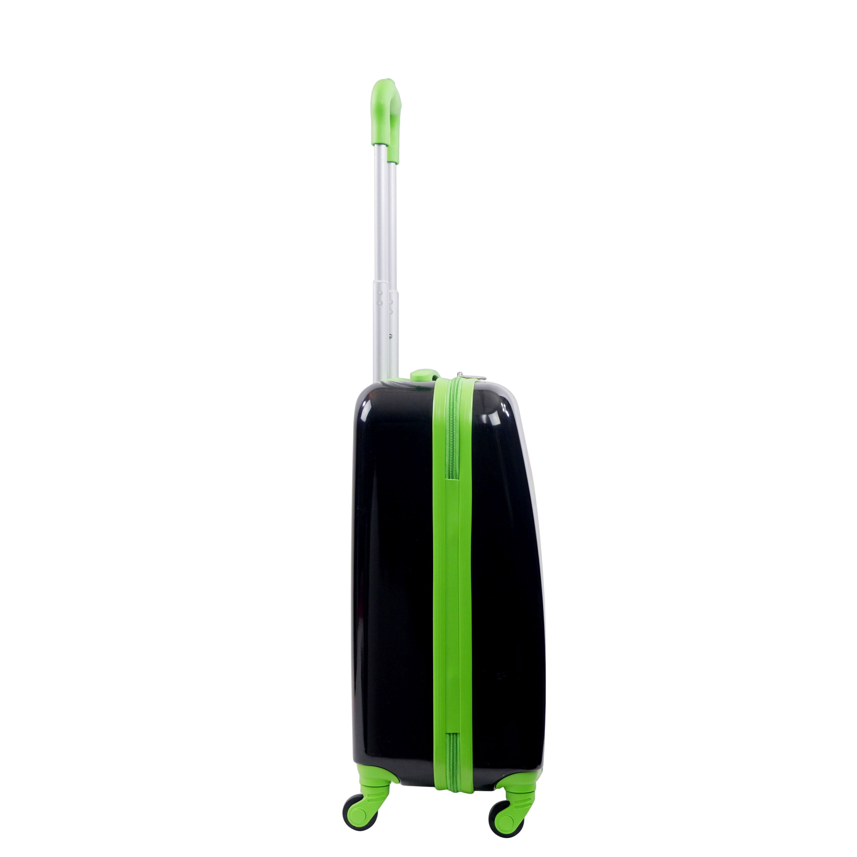 Children’s hard sided luggage with a visually striking design featuring Ninja Turtle characters Leonardo, Michelangelo, Donatello, Raphael, and the Teenage Mutant Ninja Turtles logo against a sleek black background; Hard side luggage carrier meets most airline requirements for carry-on luggage and fits into most overhead bins Hard luggage features double zippers, a sizable polyester-lined main zip compartment for easy packing of your child’s belongings, a zip wet dry compartment for personal essentials, and clothing compression straps to keep clothing from wrinkling Wheeled luggage features a lightweight upright design with 4 360-degree spinner wheels, and features a top carry handle for easy loading into trunks, cars and overhead bins; features a top retractable handle which allows for effortless movement for boys and girls during travel Kid travel luggage bags feature a hard shell ABS plastic case which protects your luggage and are easy to spot clean; officially licensed Nickelodeon product ensures that you are receiving quality TMNT hardside luggage Lightweight luggage spinner suitcases measure 20.5 H x 13 W x 8.5 D in inches, and weighs 4.5 lbs