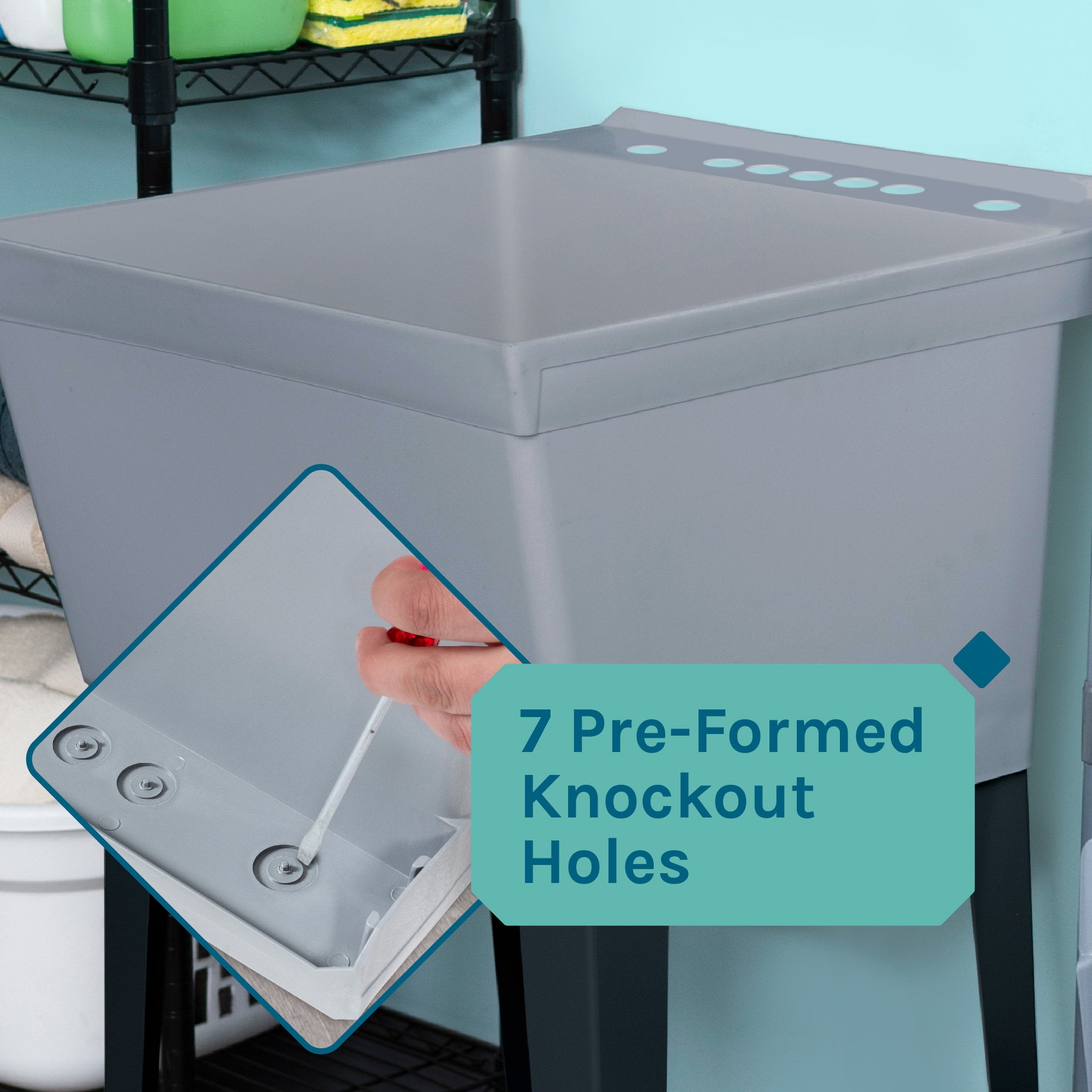 Extra deep 19-gallon capacity tub Multiple pilot holes can accommodate varying faucet setups and sizes, as well as other accessories 3.5 inch back deck with pitched back lip to place accessories and catch splashing 1.25-inch off-centre drain prevents drain cut-off and provides additional under sink storage area Assembled tub measures 23.25 in L x 22.75 in W x 33.5 in H Metal hybrid faucet with ABS Plastic lead-free waterways Single handle lever allows for temperature and water flow control Medium grey tub color