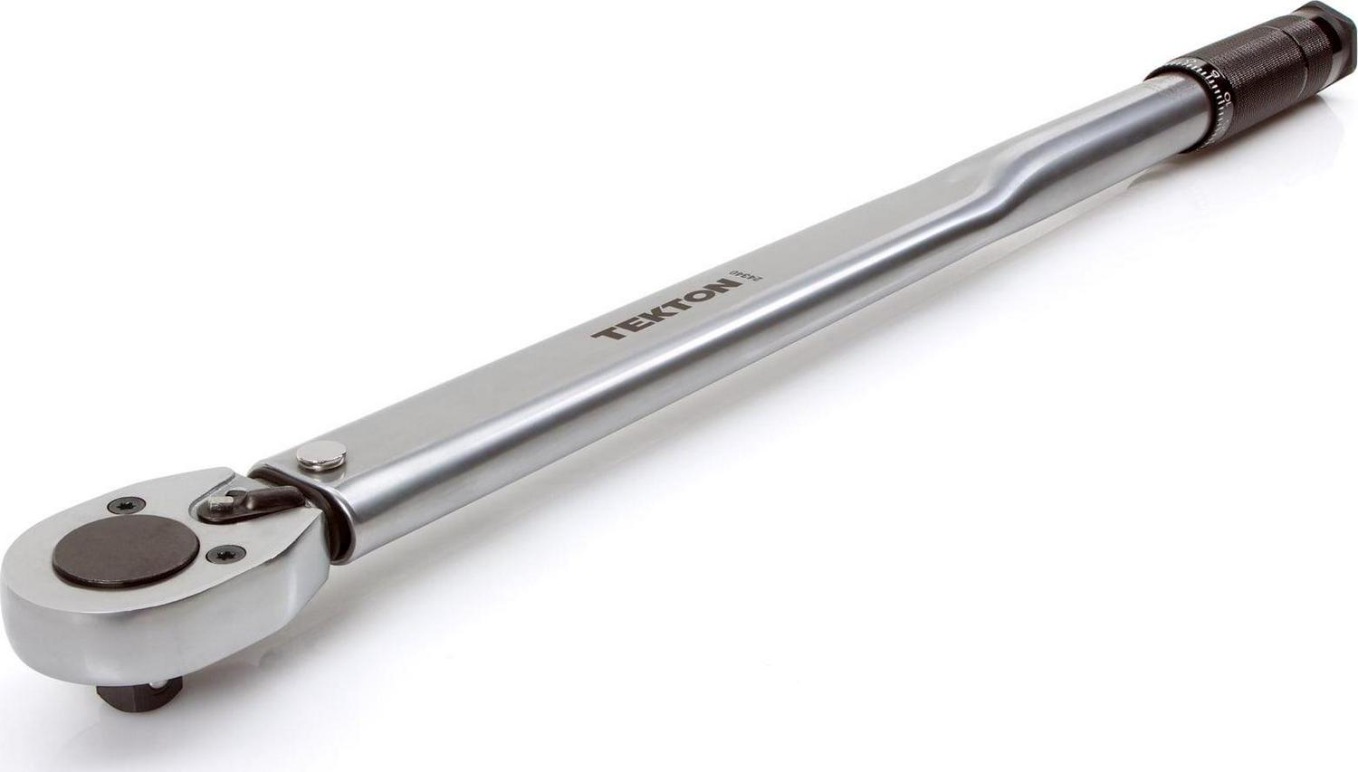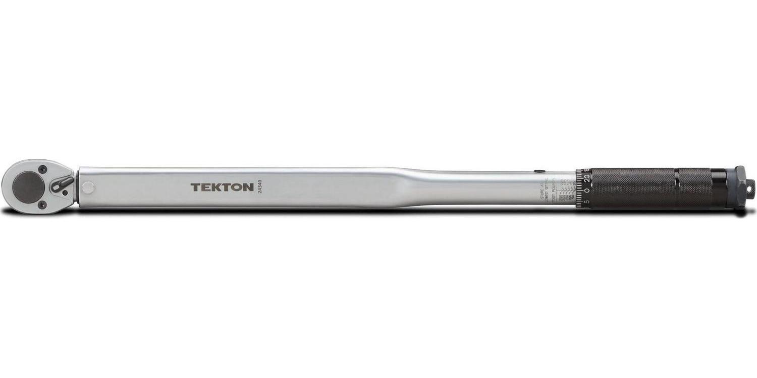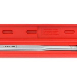 Calibrated to an accuracy of +/- 4%, the TEKTON 1/2 in. Drive Click Torque Wrench lets you work with confidence, eliminating guessing and the common tendency to overtighten fasteners. Correctly tightening fasteners to a vehicle or equipment manufacturer’s torque specifications ensures parts are properly secured without being damaged. Simple and easy to use, this wrench has a reversible ratcheting head that drives fasteners in both directions and measures torque in the clockwise direction. To measure torque, set the desired value on the handle scale (foot pounds or Newton meters) and begin tightening the fastener. When the present torque value is reached, a reliable mechanical operation inside the handle produces a click you can hear and feel, alerting you to stop applying force. Built for consistent performance and years of dependable service, the mechanical design doesn’t need batteries, and the all-steel construction has no plastic parts to break or wear out.