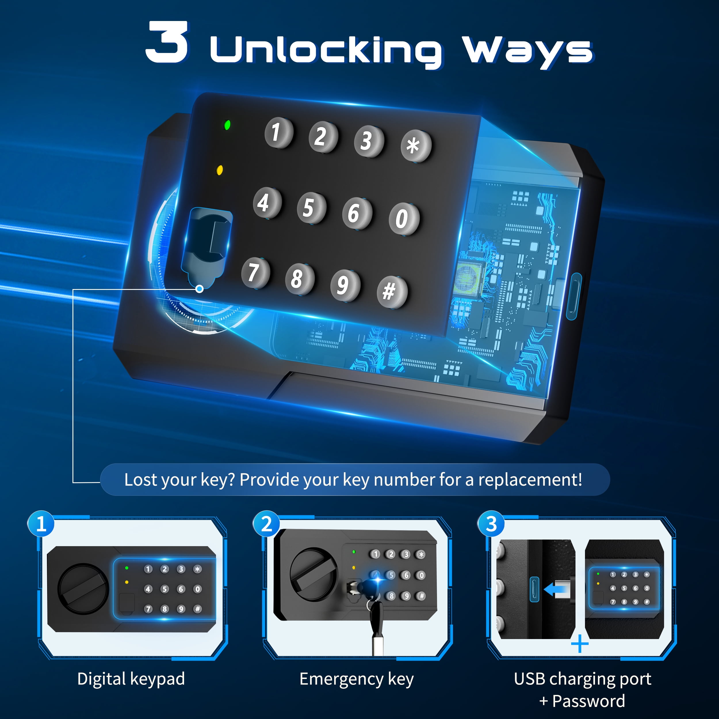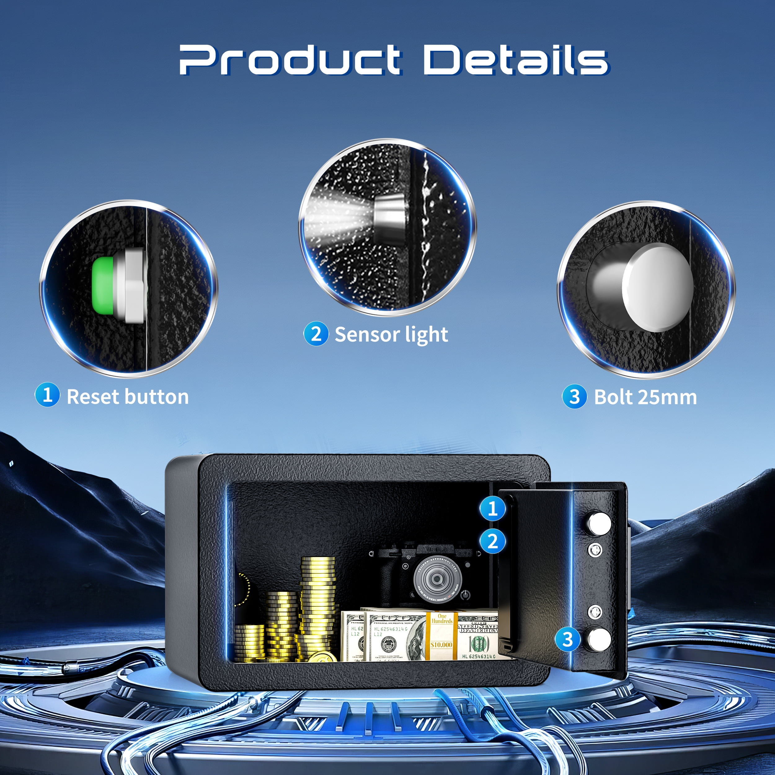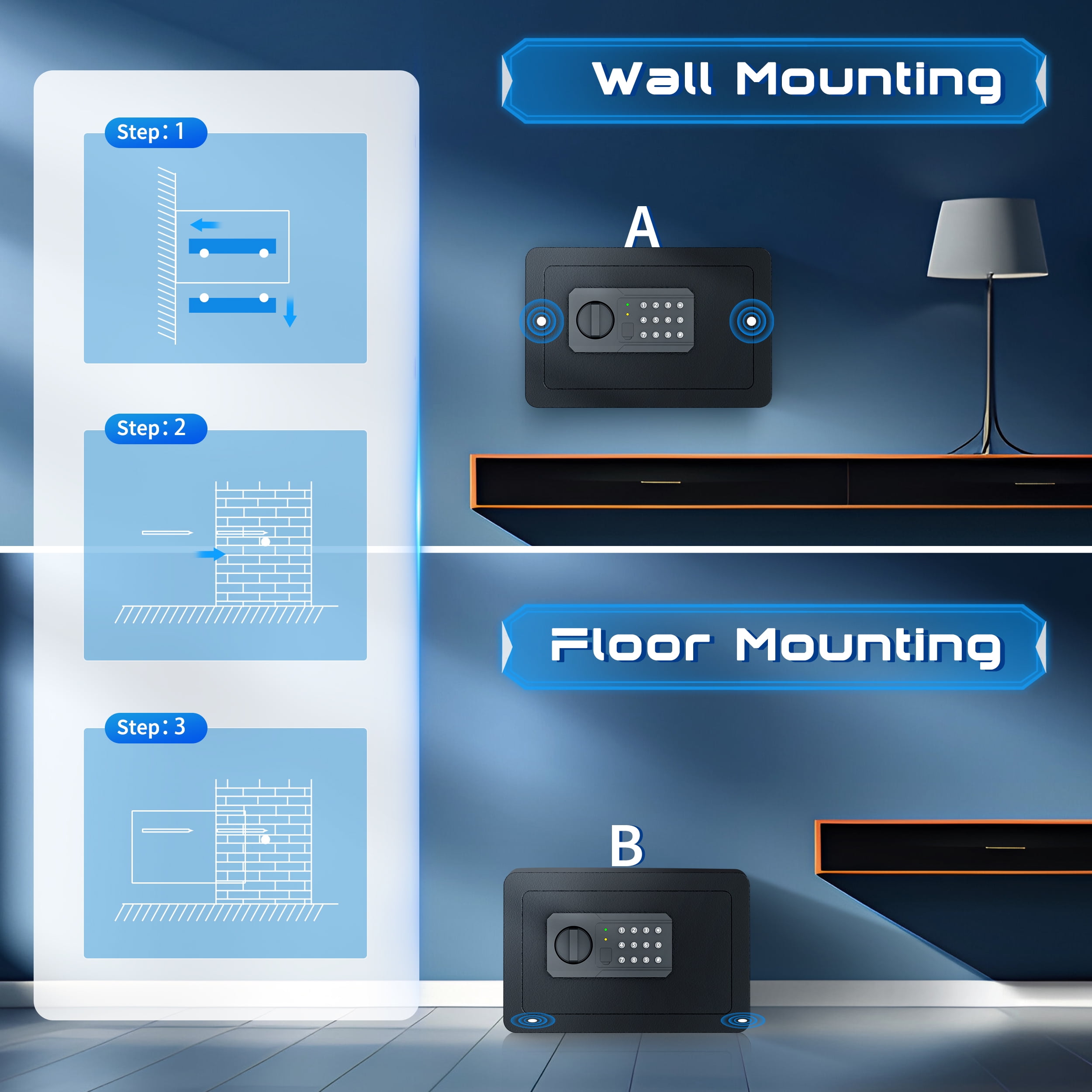 ▶ KEY FEATURES: 🏅🏅【High-density alloy locking bolts】: Carefully selected materials. Enhanced drill and pry resistance. 🏅🏅【Dual Locking Options】: Enjoy the convenience of two unlocking methods: customizable keypad entry with 3-8 digit password options, or traditional key access. Plus, receive a complimentary external emergency battery box for continued access even if the main batteries fail. 🏅🏅【Advanced Security Alerts】: Stay protected with our comprehensive security features 1.Automatic lockout for 5 minutes after three consecutive incorrect password attempts, accompanied by a 5-minute alarm. 2.Activate vibration alerts by long-pressing “#” or “*” for immediate notification of any unauthorized movement or impact on the safe. 🏅🏅【Durable Construction and Anti-Theft Design】: Built from solid steel with a 25mm locking bolt and a 50mm thick door, our safe is engineered to resist theft, tampering, and drilling. 🏅🏅【Smart internal design】: Removable partition allows efficient storage of various items. 🏅🏅【Optional Accessories Available】: Customize your security setup with our optional accessories, including a $20 fireproof and waterproof document bag, perfectly sized for A4 documents. 🏅🏅【Secure Installation】: Our comprehensive installation kit includes all necessary hardware for secure mounting in concealed spaces such as walls or closets using expansion screws. 🏅🏅【EASY TO INSTALLATION】: This personal safe box has pre-drilled mounting holes in the back and expansion screws are included in the accessory box. You can fix it with the wall or cabinet. 💖【365 Day Free Key Replacement】: If you lose your key, we can send you a new one. We have a 24-hour online customer service. If you have any questions or have any questions, please contact me at the first time. ▶ SPECIFICATIONS: Brand: TELAM Color: Black Material: Alloy Steel Battery Type: 4 x AAA Batteries (Batteries Not Included) ▶ Package Include:: 1*Electronic Digital Safe Box 1 x Fireproof Bag 4*Expansion screw 2*Emergency key 1*Pad blanket 1*Fireproof waterproof bag 1*Gun rack 1*Manual