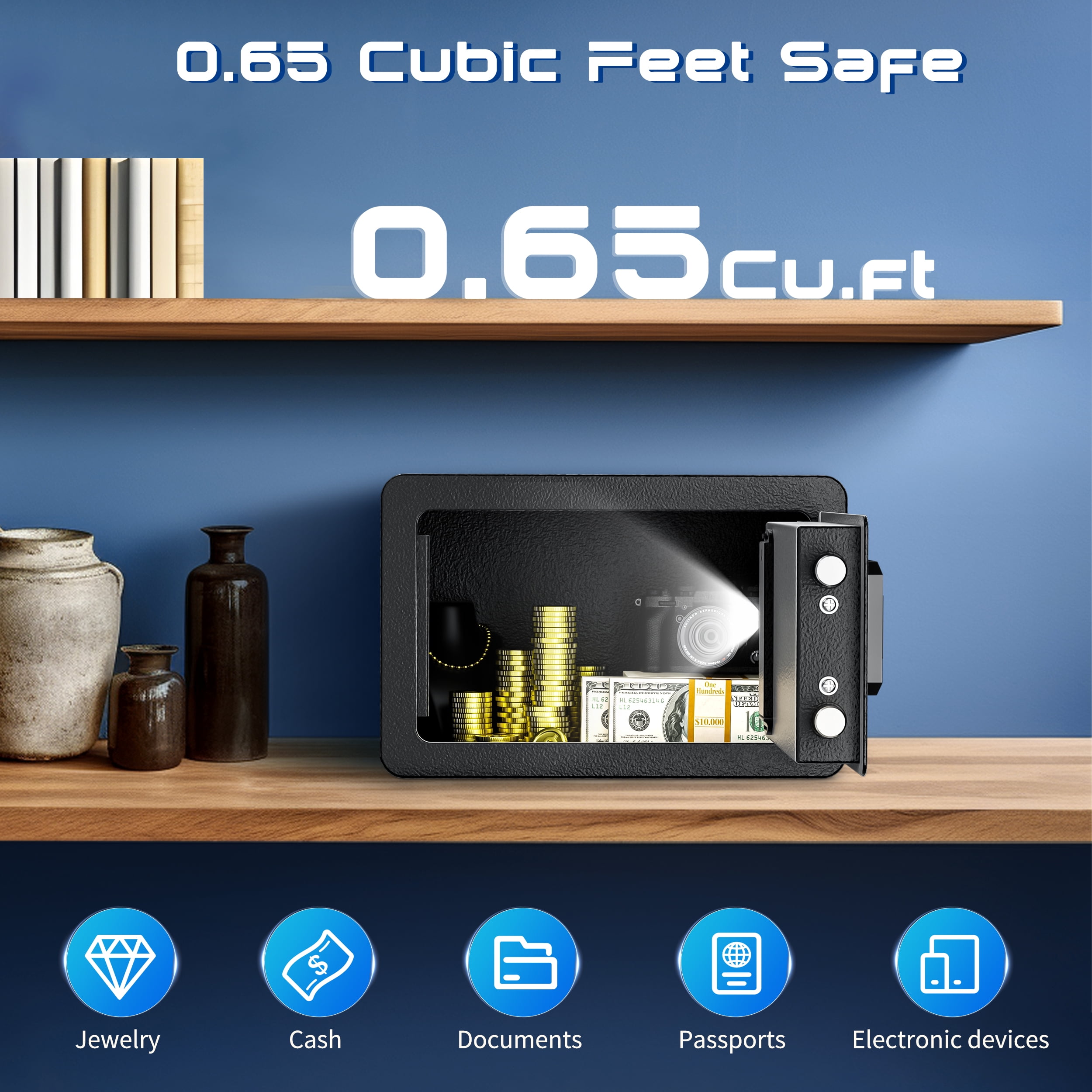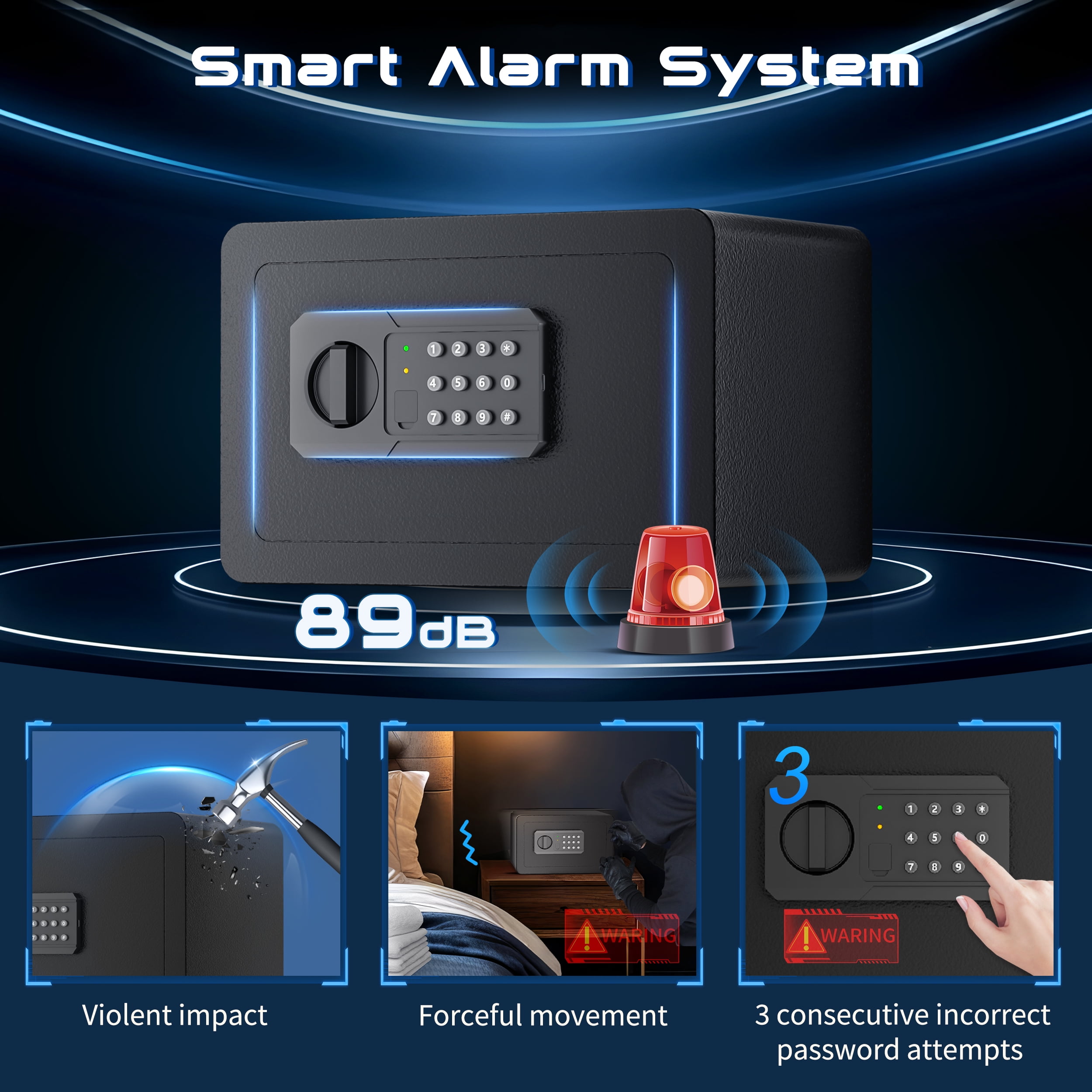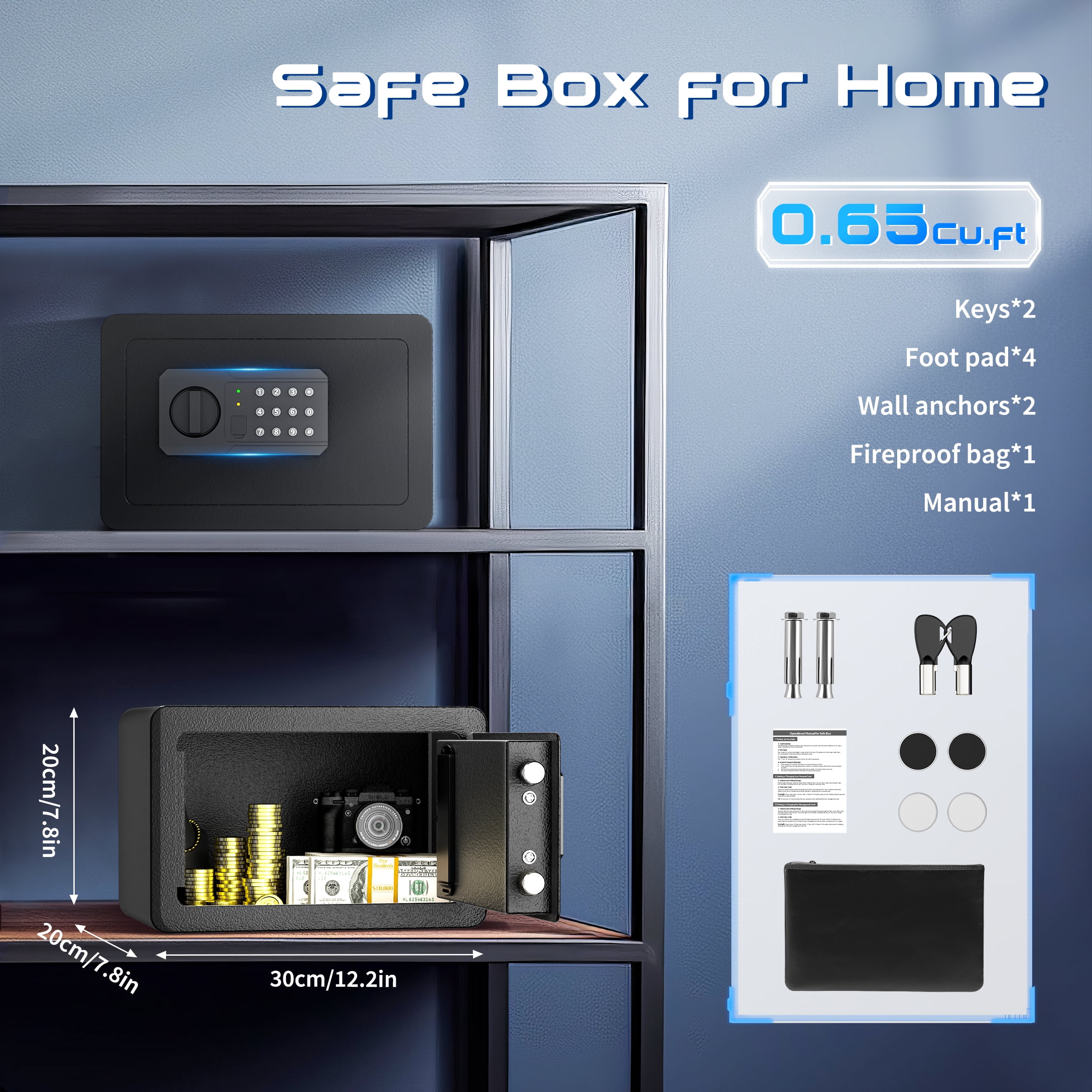 TELAM 0.65 Cu. ft. Safe Box, Fireproof, Keys & Digital Keypad Lock, Home Safe for Money, Wall Mountable, Black The TELAM safe features a dual alarm system that prioritizes security, ensuring peace of mind at home or in the office. It uses high-density alloy bolts with anti-drill and anti-pry capabilities and includes multiple alarms for low battery, tamper vibrations, and misoperations. The TELAM safe also boasts a seamless door edge design for comprehensive theft protection and a smart interior layout for efficient organization of items.